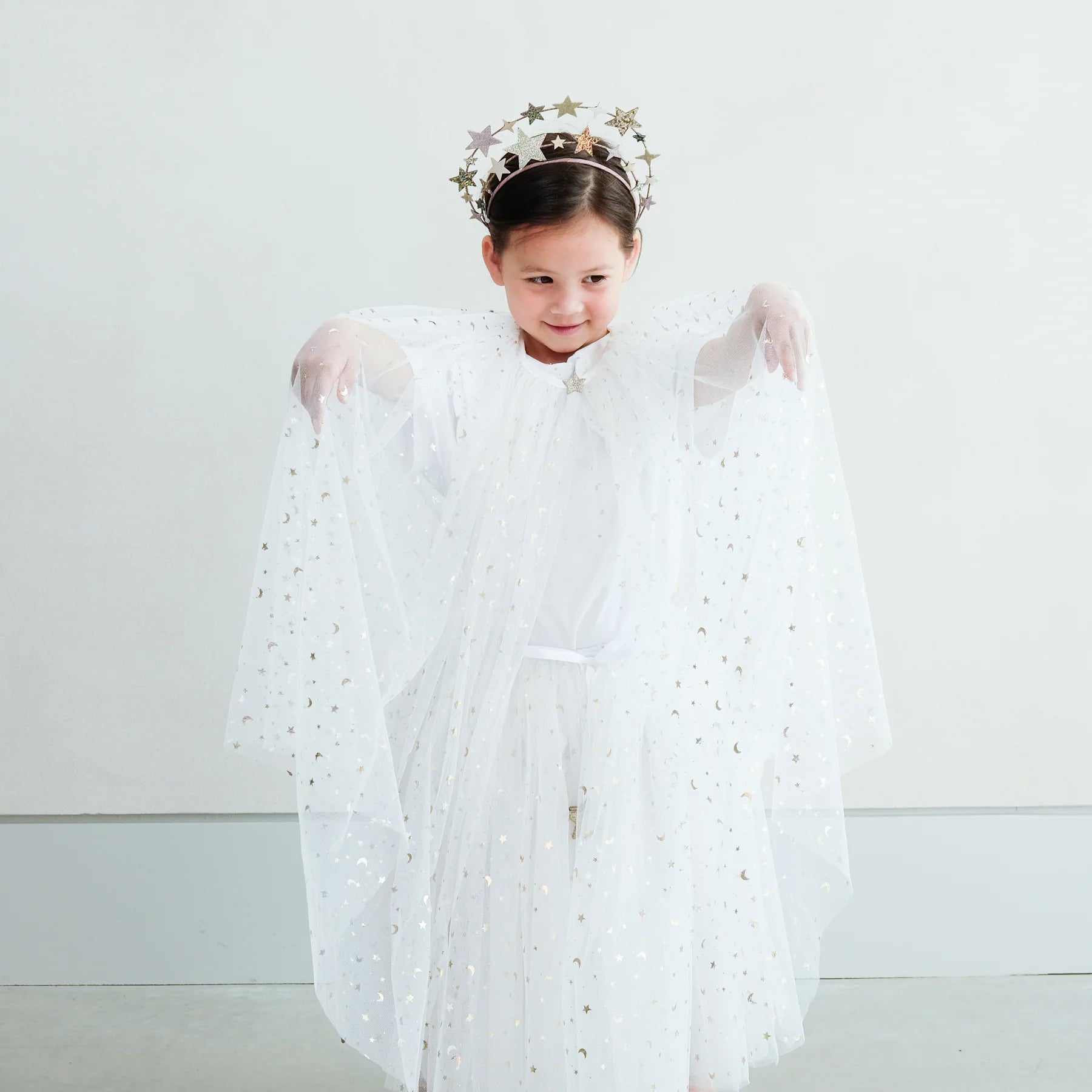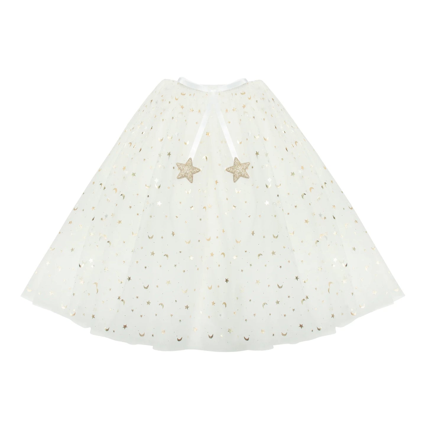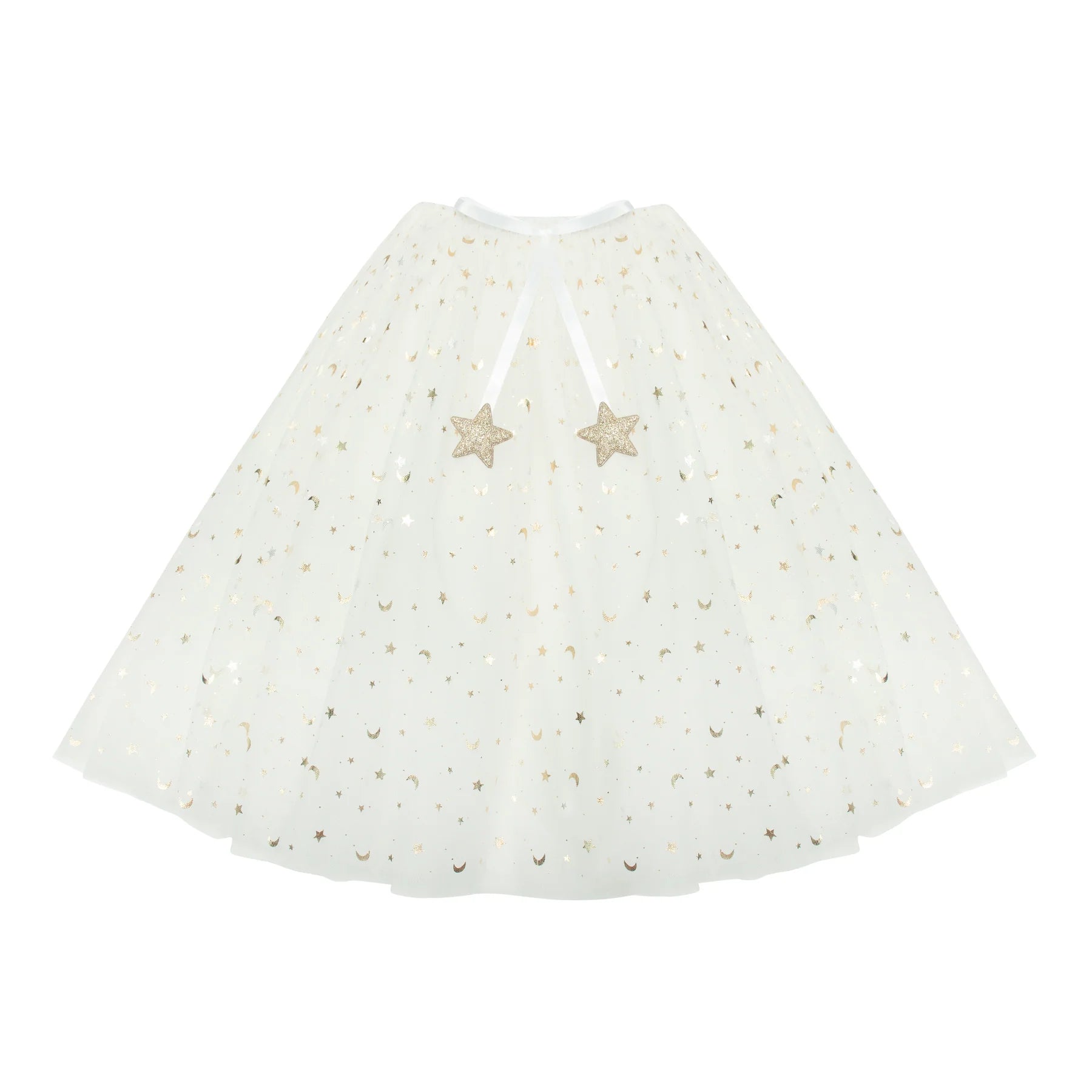 - Layers of beautiful white tulle embellished with metallic gold moons and stars