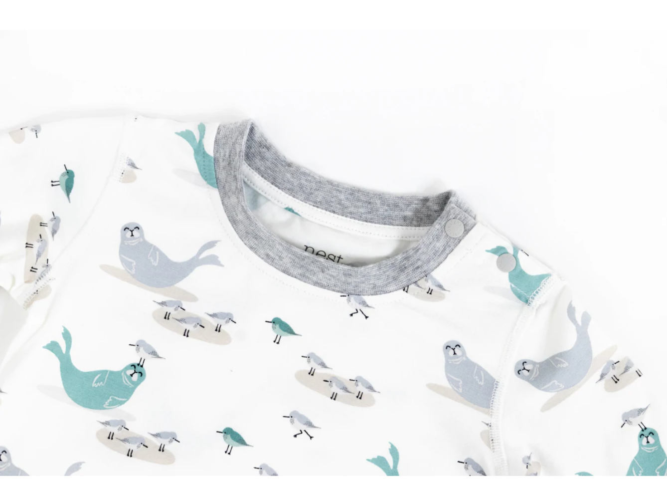 The long sleeve PJ set comes in our cute, Basking Buddies print. The hand drawn print shows friendly sea pups and seagulls enjoying the beach.