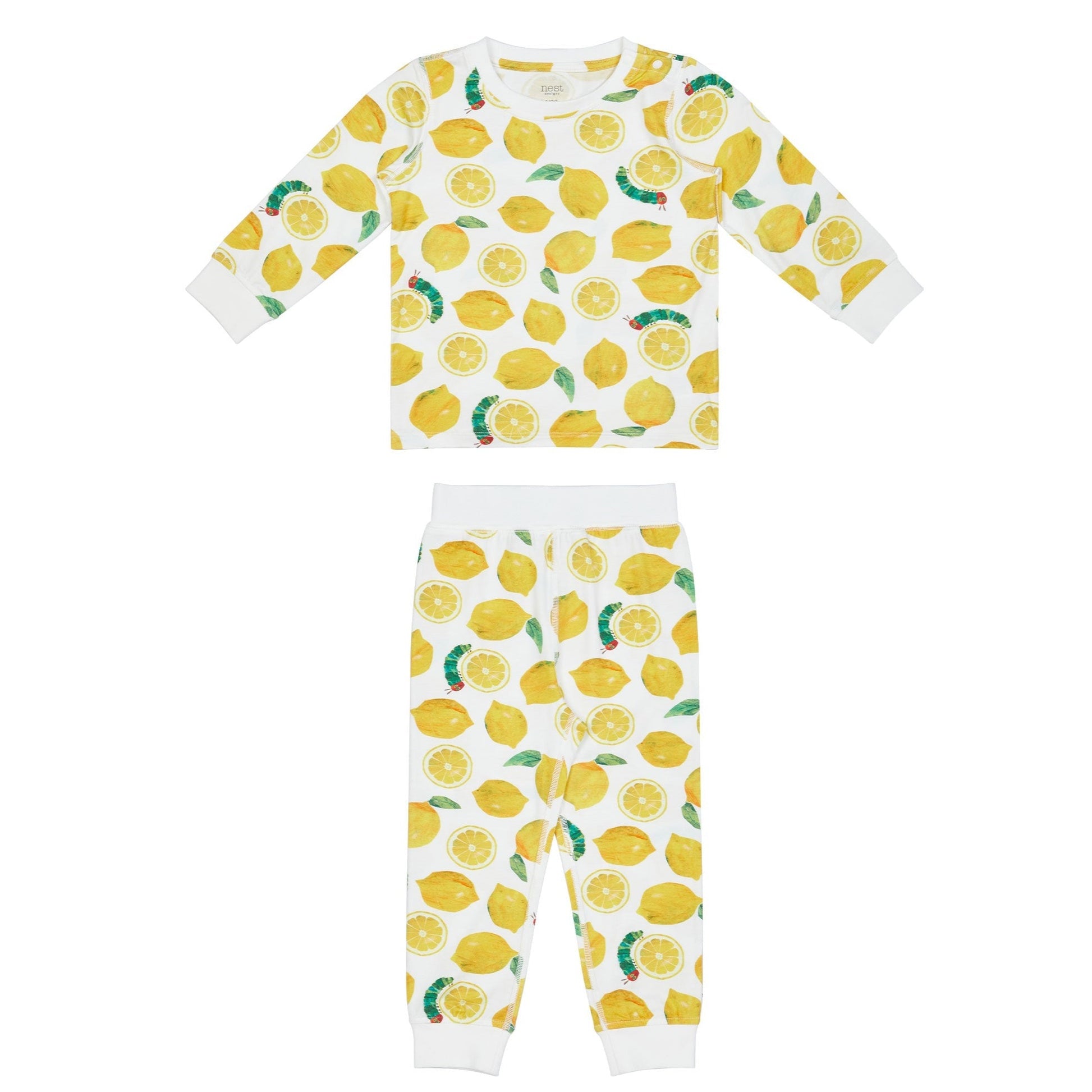 The long sleeve PJ set comes in our Lemon Squeezy print, a new addition to our Eric Carle collection. It features one of the most beloved children's books characters, the Very Hungry Caterpillar eating bright yellow lemons, this print will brighten up yours and your little bubs' days.