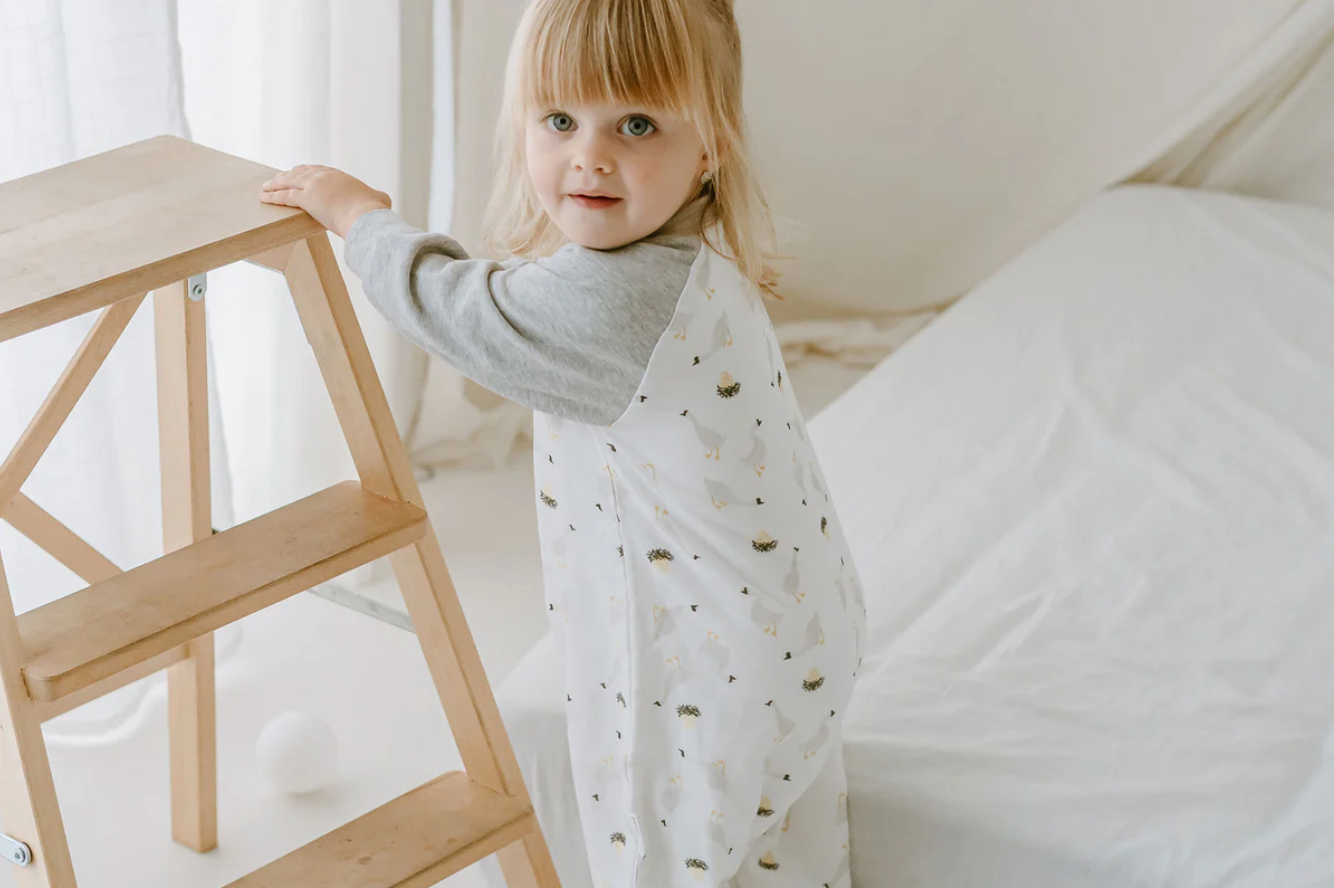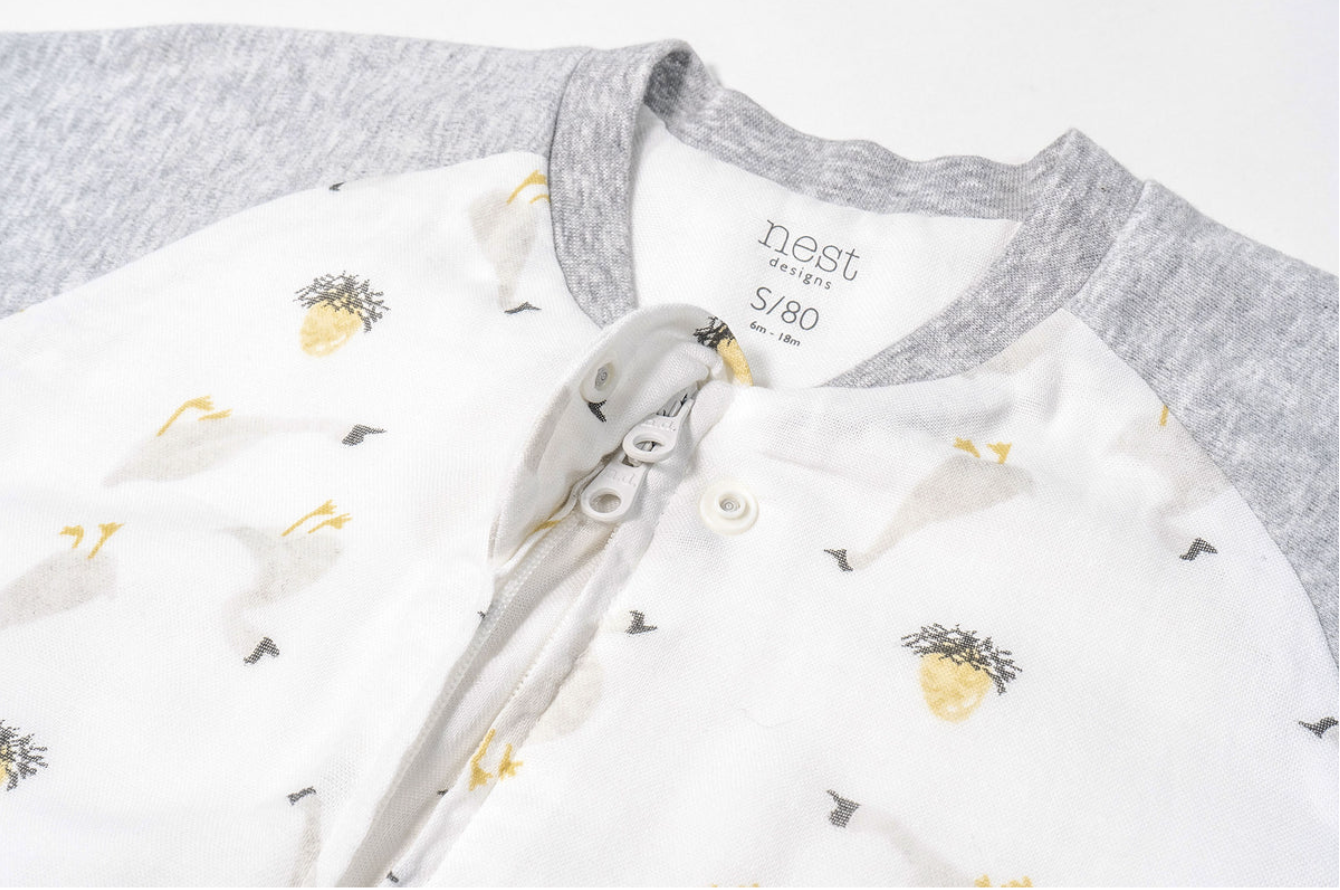 This footed sleep bag has a 2-way zip and button snaps making diaper changes quick and easy. The stretchy side panels allow your bubs to move with ease, whether in or out of bed. Our footed sleep bags are a favourite for toddlers on-the-move and perfect for the transition between a sleep sack and using a big kid blanket. This footed sleep bag comes in our The Goose & The Golden Egg print, a part of our SS23 Aesop’s Fables collection.