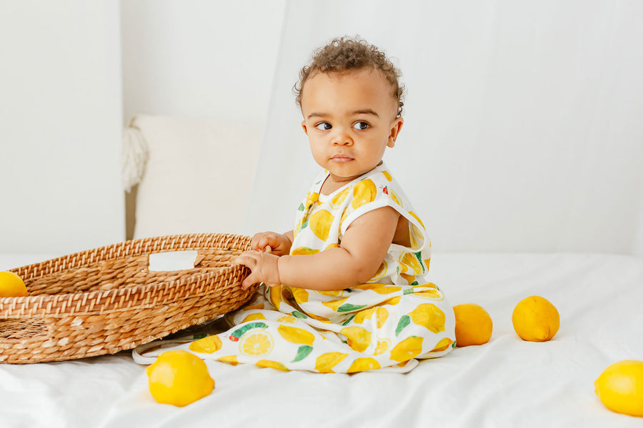 This sleeveless sleep bag comes in our vibrant Lemon Squeezy print, a new addition to our Eric Carle collection. It features one of the most beloved children's books characters, the Very Hungry Caterpillar eating his way through the herb garden, this print is an ode to the children's book author and illustrator.