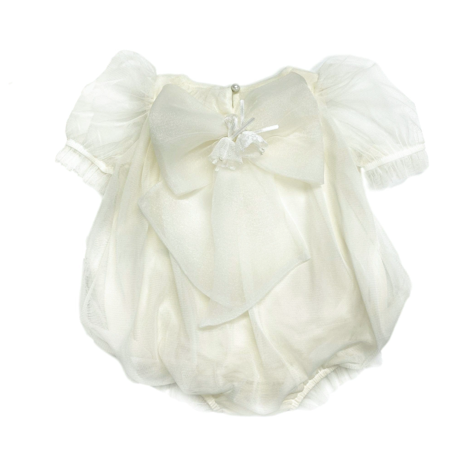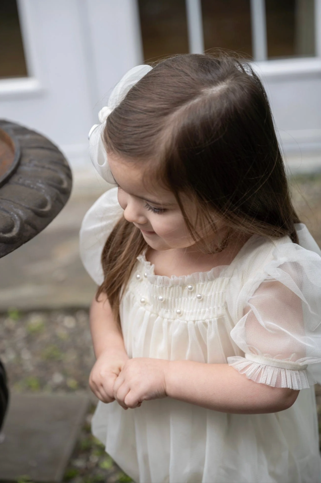 The Bella Romper is the perfect little outfit for any occasion. Crafted with an ivory-colored tulle material and featuring a smock front, faux pearl detailing, and an organza bow with bell decorations, this romper is a sure show-stopper. The sheer tulle sleeves complete the look.