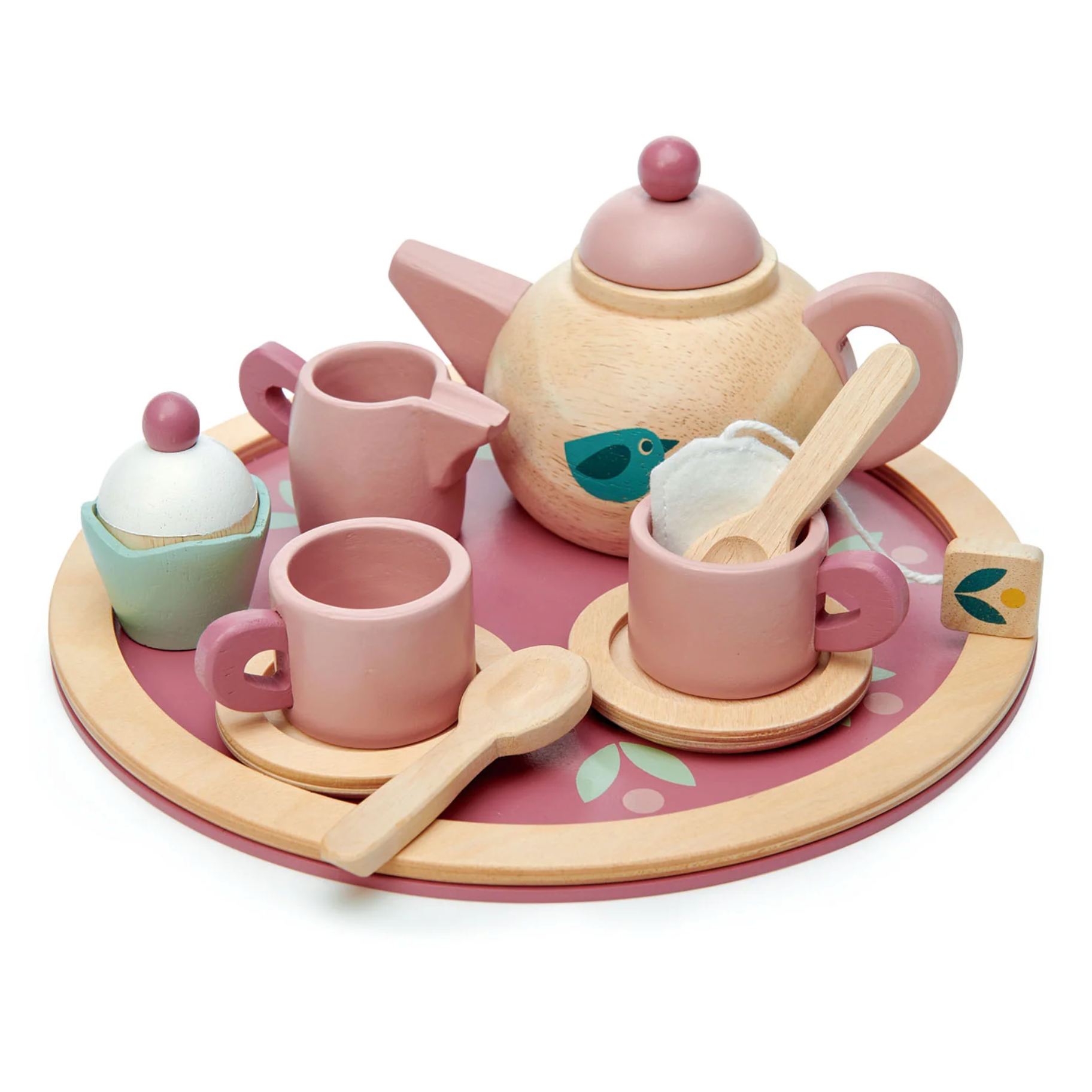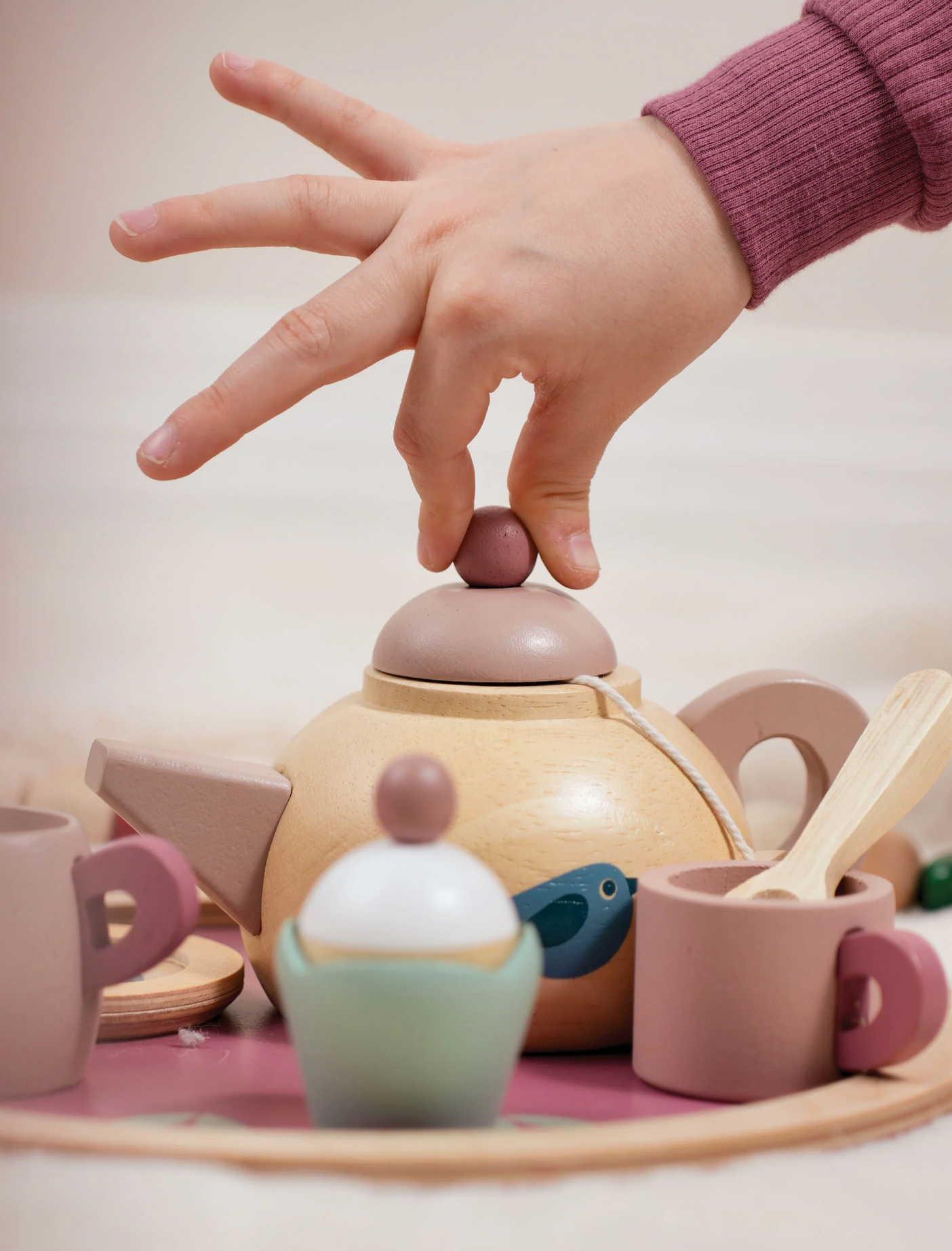 A romantic wooden tea set featuring a pretty bird motif on the saucers and the side of a solid wood teapot.
