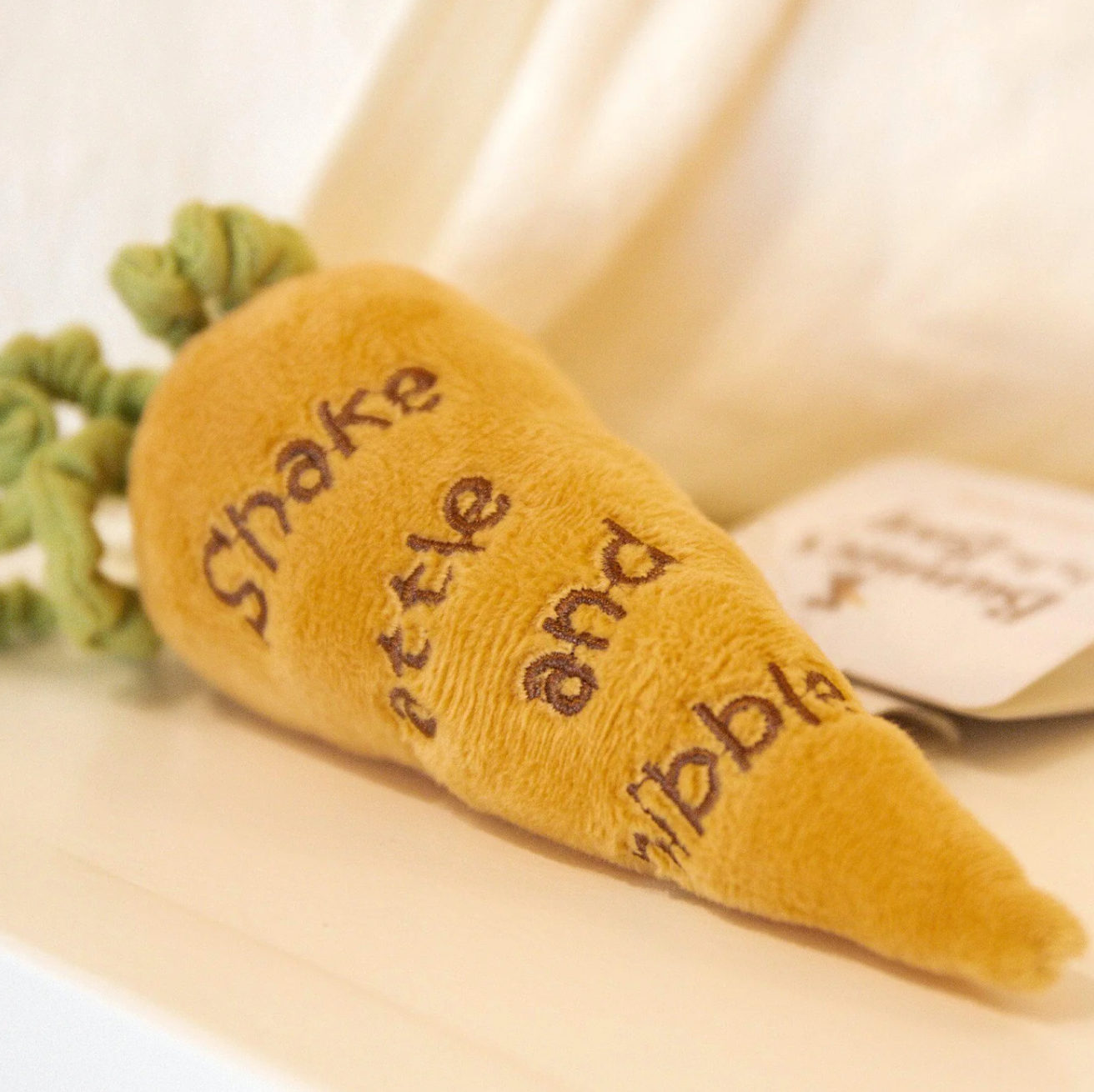 This adorable little veggie rattle has "Shake rattle and nibble" embroidery on our vibrant orange velour carrot with crinkly green leaves. It's not only cute, but helps with tactile and sensory development. The perfect way to entertain your little bunny!