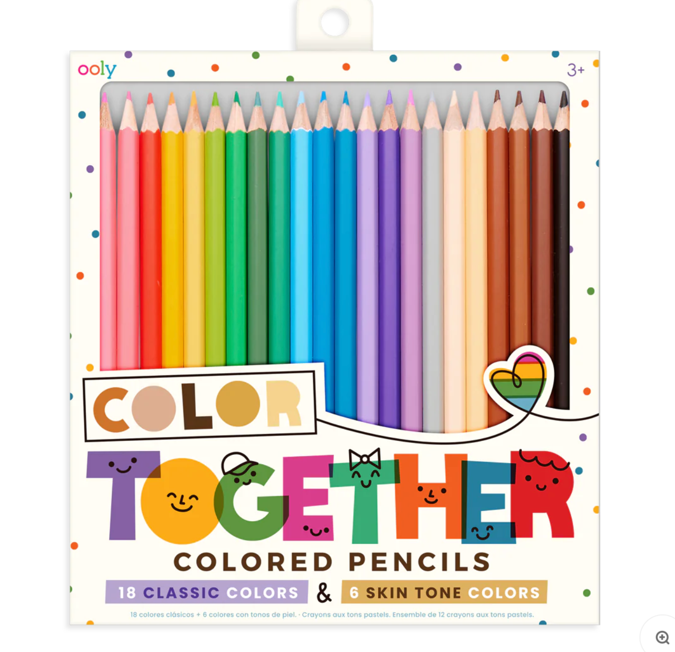 Grab your friends, your family, your teachers, or your neighbors and get ready to color together. This 24 pack of colored pencils features 18 classic shades, plus 6 skin tone colored pencils so you’ll have plenty of color for everyone! With the Color Together Colored Pencils you can create more detailed and realistic art. The 18 classic shades allow you to color anything you can dream up, while the 6 skin tone shades allow you to draw yourself and anyone else in a way that best represents them. The 24 pack of colored pencils is perfect for all art projects large and small, so grab a friend and any of the OOLY sketchbooks, and get ready to color together! Suitable for ages 3 and up.