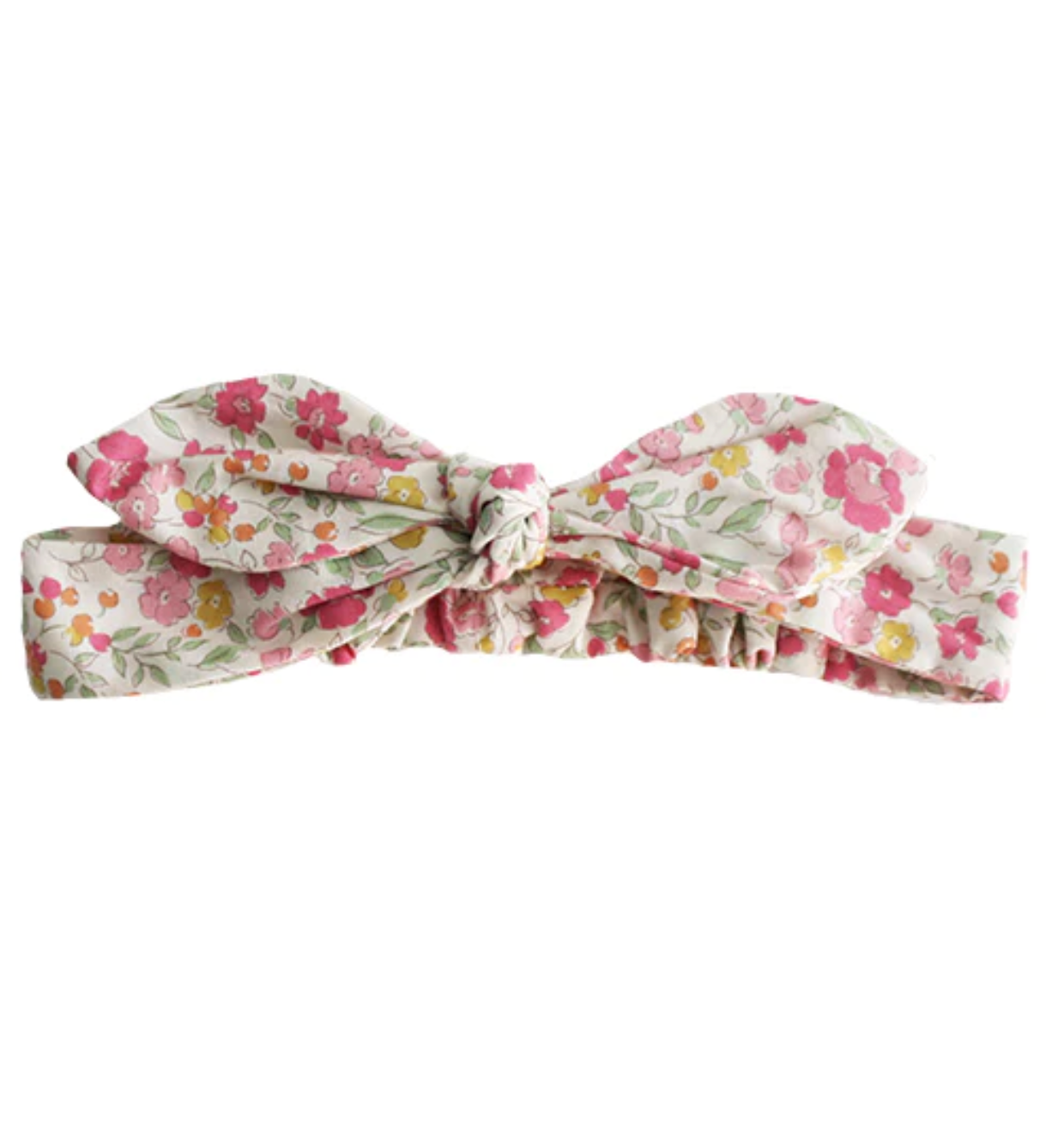 Adjustable head bow band that can be untied and re-tied. It has an encased elastic portion at the back to allow for extra stretch when tied.