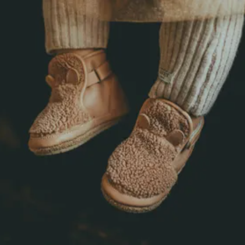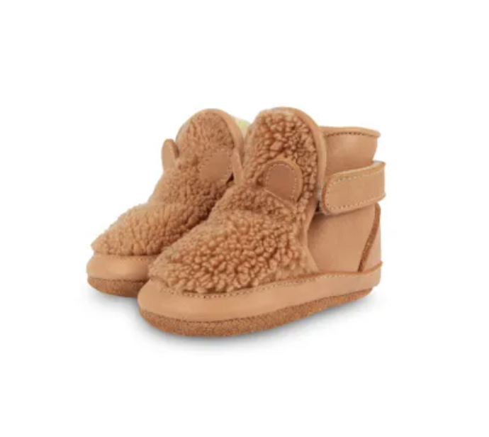 Stepping outside has never been this much fun! The shoe is lined with faux fur to keep your little one warm. The outside is covered with curly faux sheep fur and handmade leather ears. The shoes match perfectly with the Richy Mittens for the full bear effect!