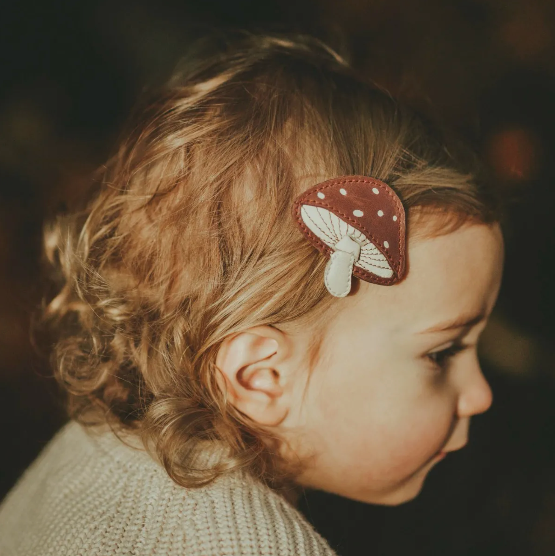Natures wonder! The Forest Toadstool Hairclip is a beautiful imagination-evoking accessory. While the hairclip adds a lovely wintery touch to your little girl's updo, she can play and fantasise about snowy holidays and a magical winter! Made from 100% leather. The Forest Hairclip could also be used as a cute accessory when clipped on clothing.