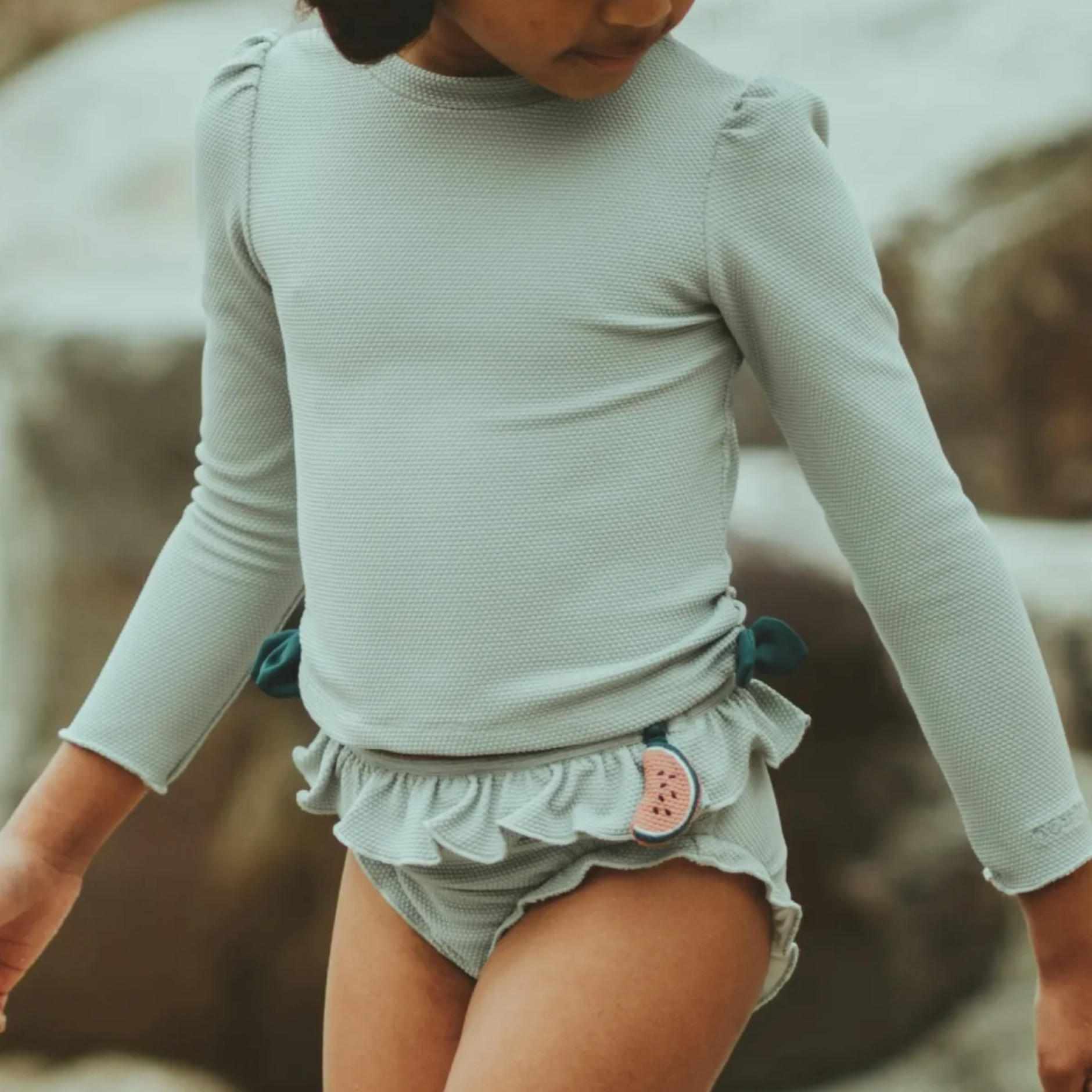 Juicy and fun! This pretty swim shirt will keep your little one safe from the hot summer sun in style. The shirt features an embroidered Donsje logo and smocked detailing. Match the Nia swim shirt with the Sisi swimming briefs.