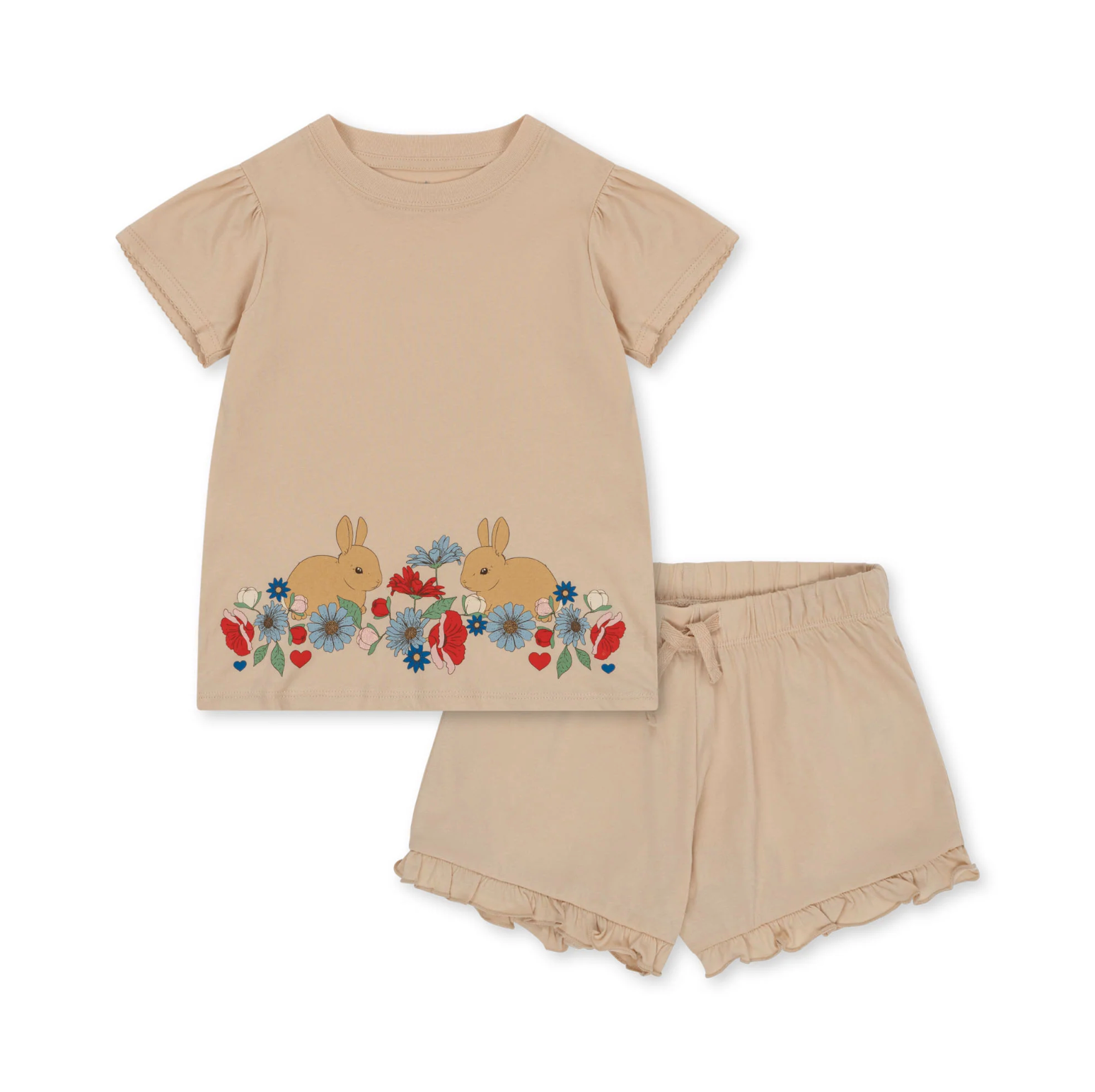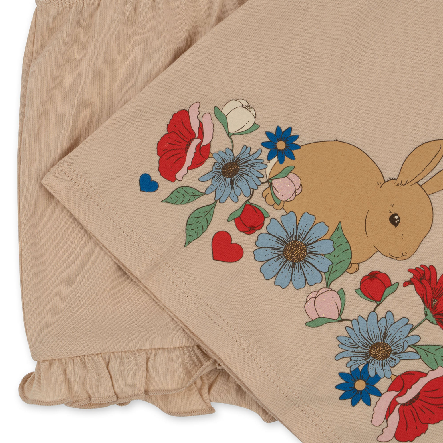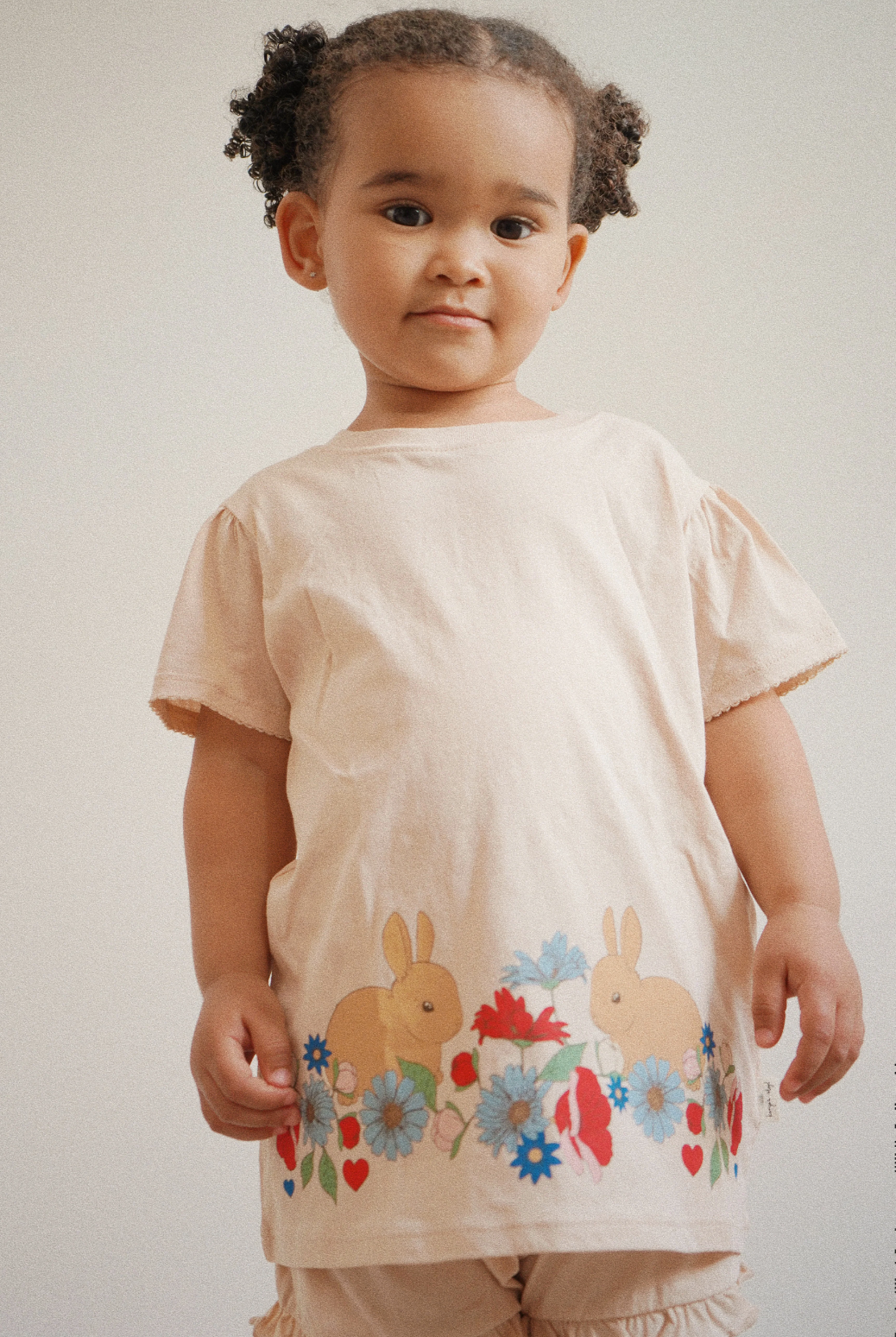 The t-shirt is designed with puff sleeves adorned with picot endings.