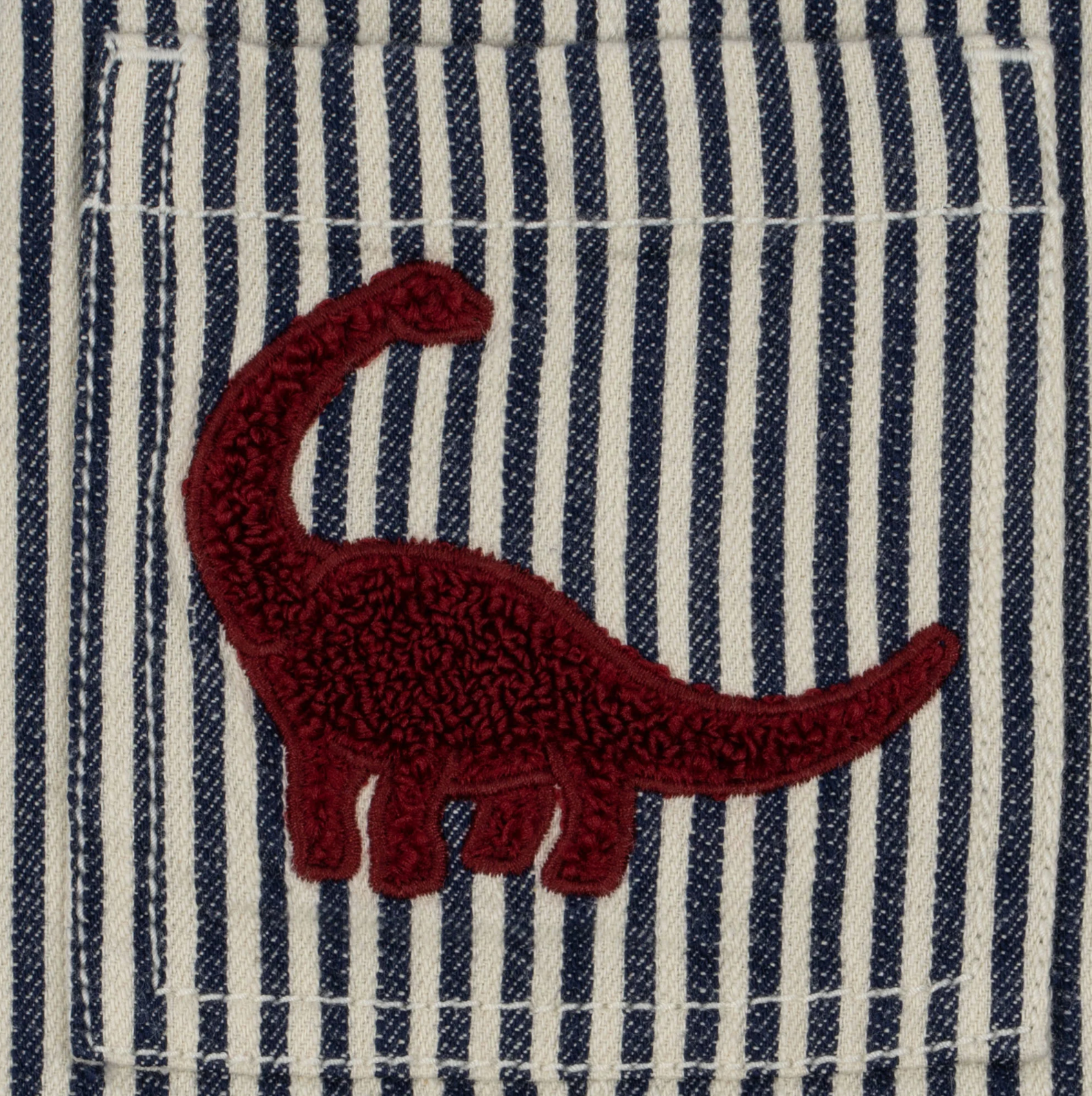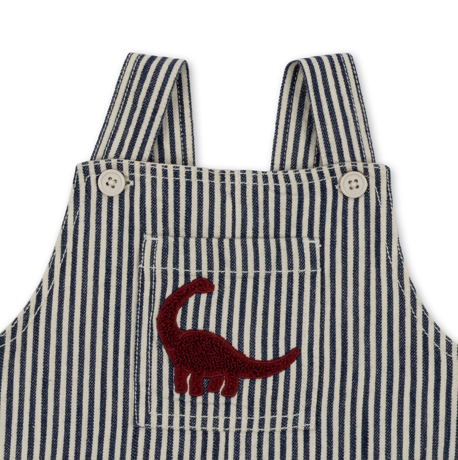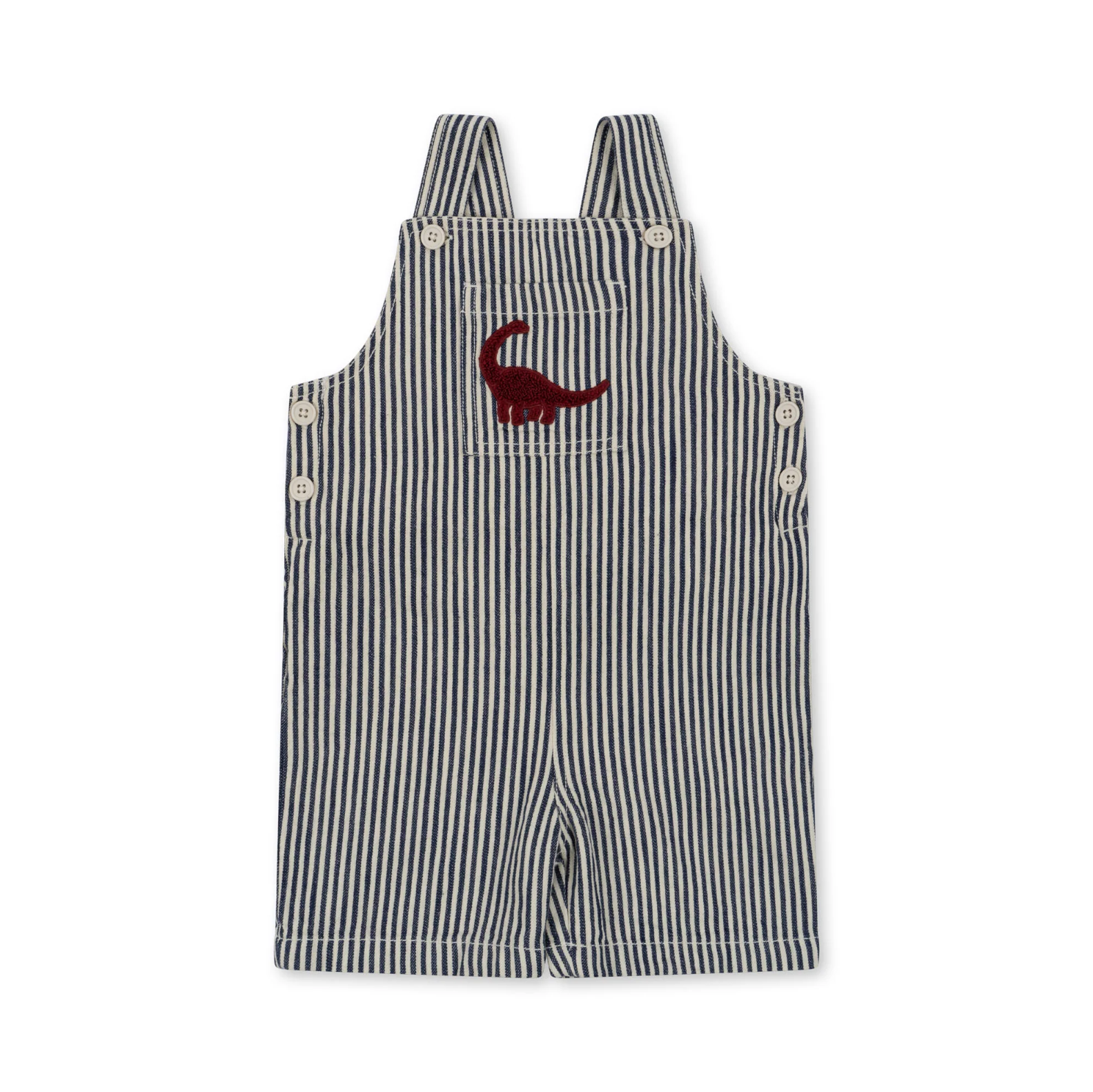 Spencer made in 100 percent organic cotton. Designed with adjustable straps and a front pocket adorned with embroidery. Features hidden snap buttons at the crotch for easy dressing.