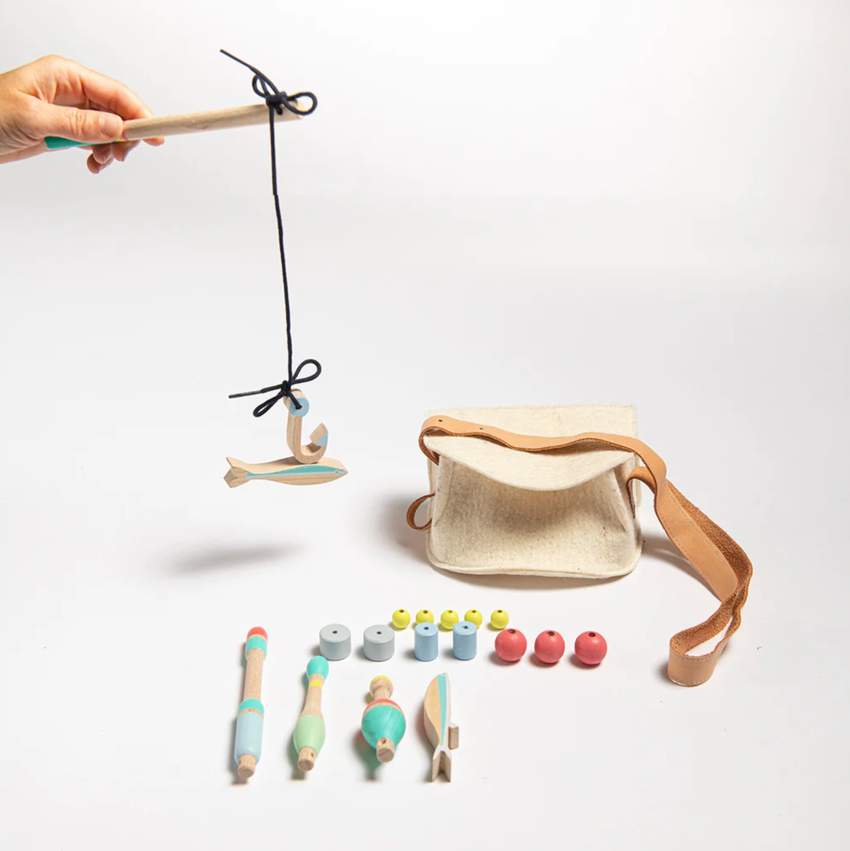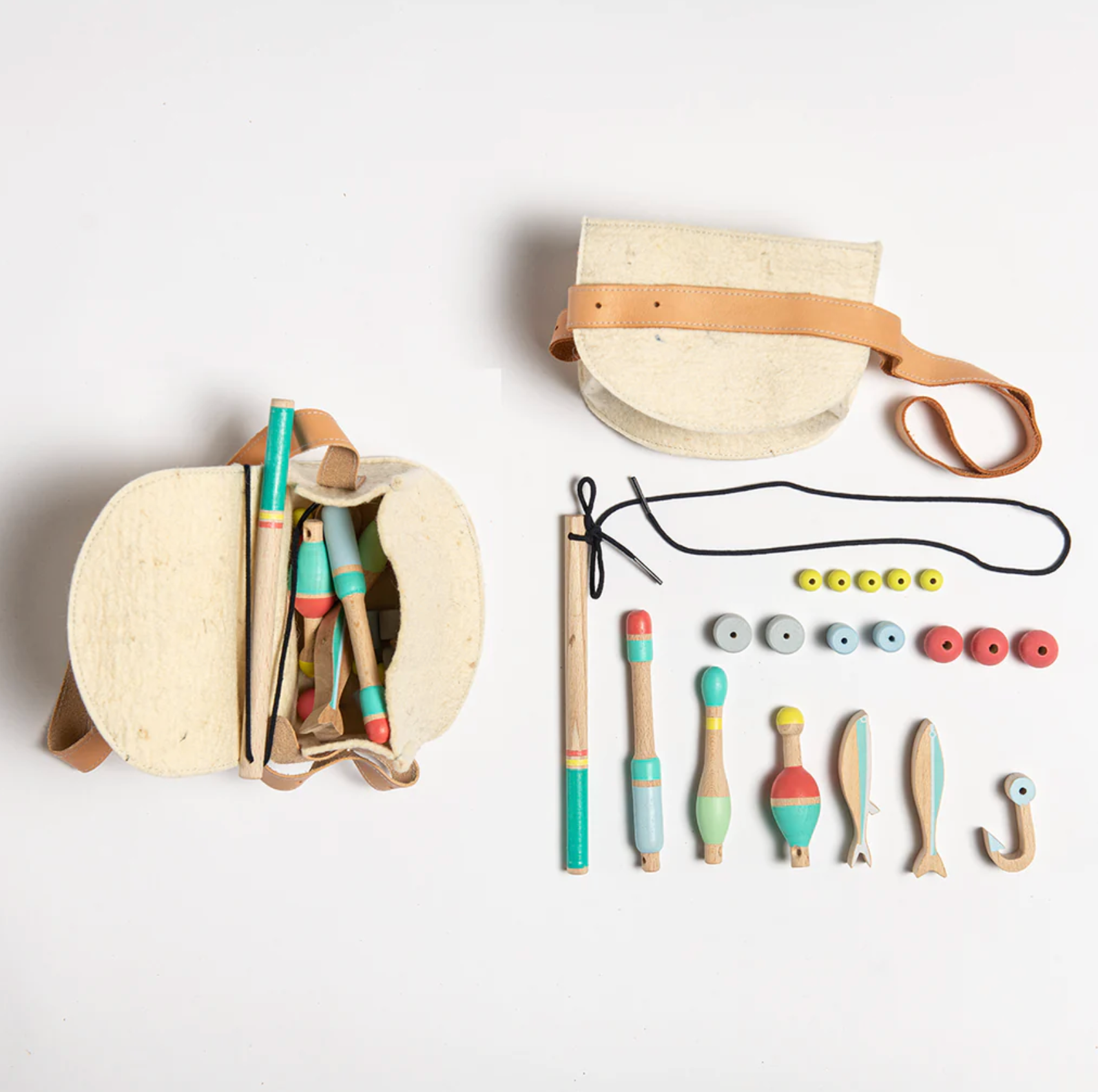The set contains: 1 fishing bag, 1 fishing rod, 1 string, 3 floats, 1 hooks, 4 leads, 2 fishes, 5 corns, 3 baits