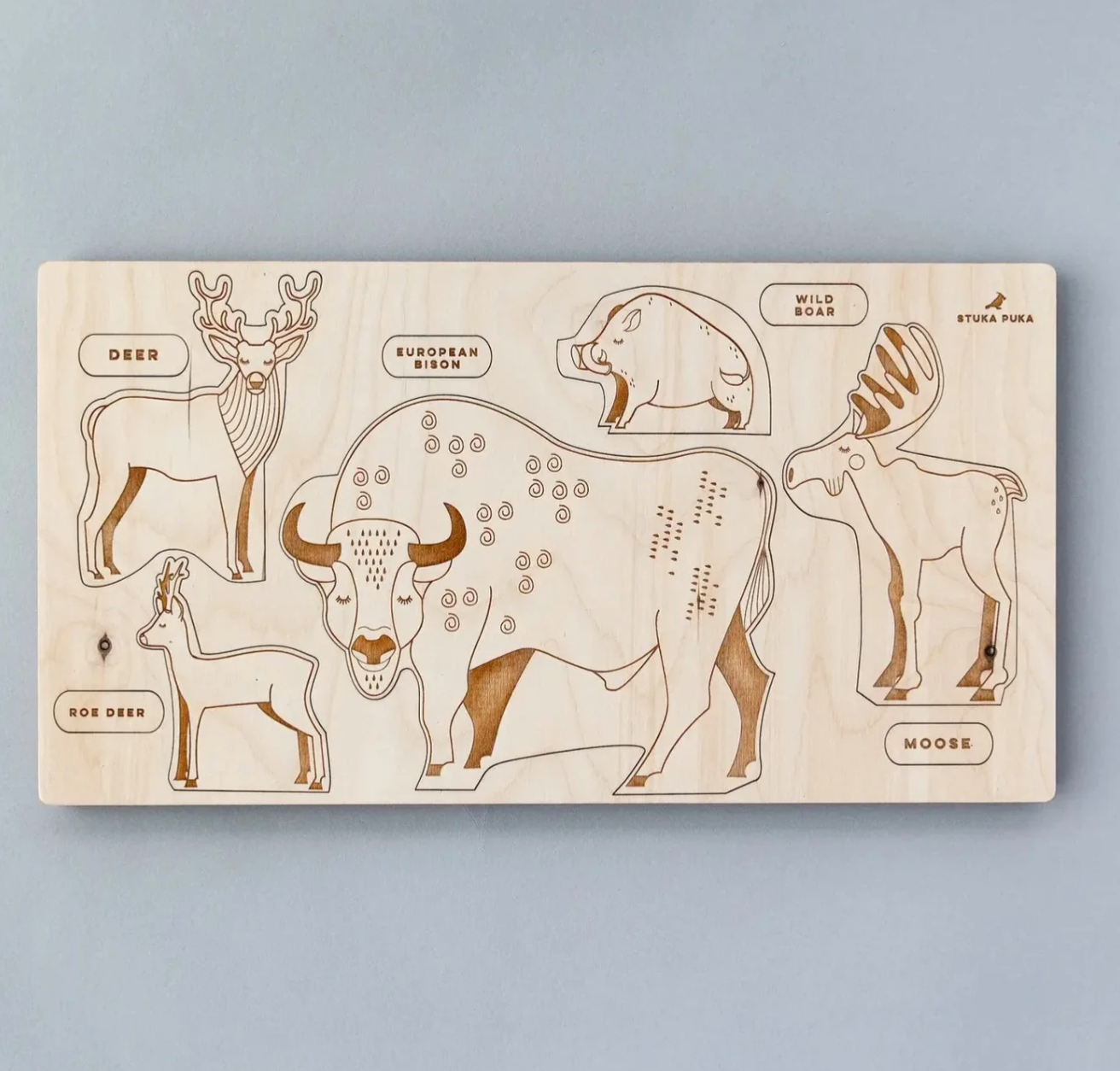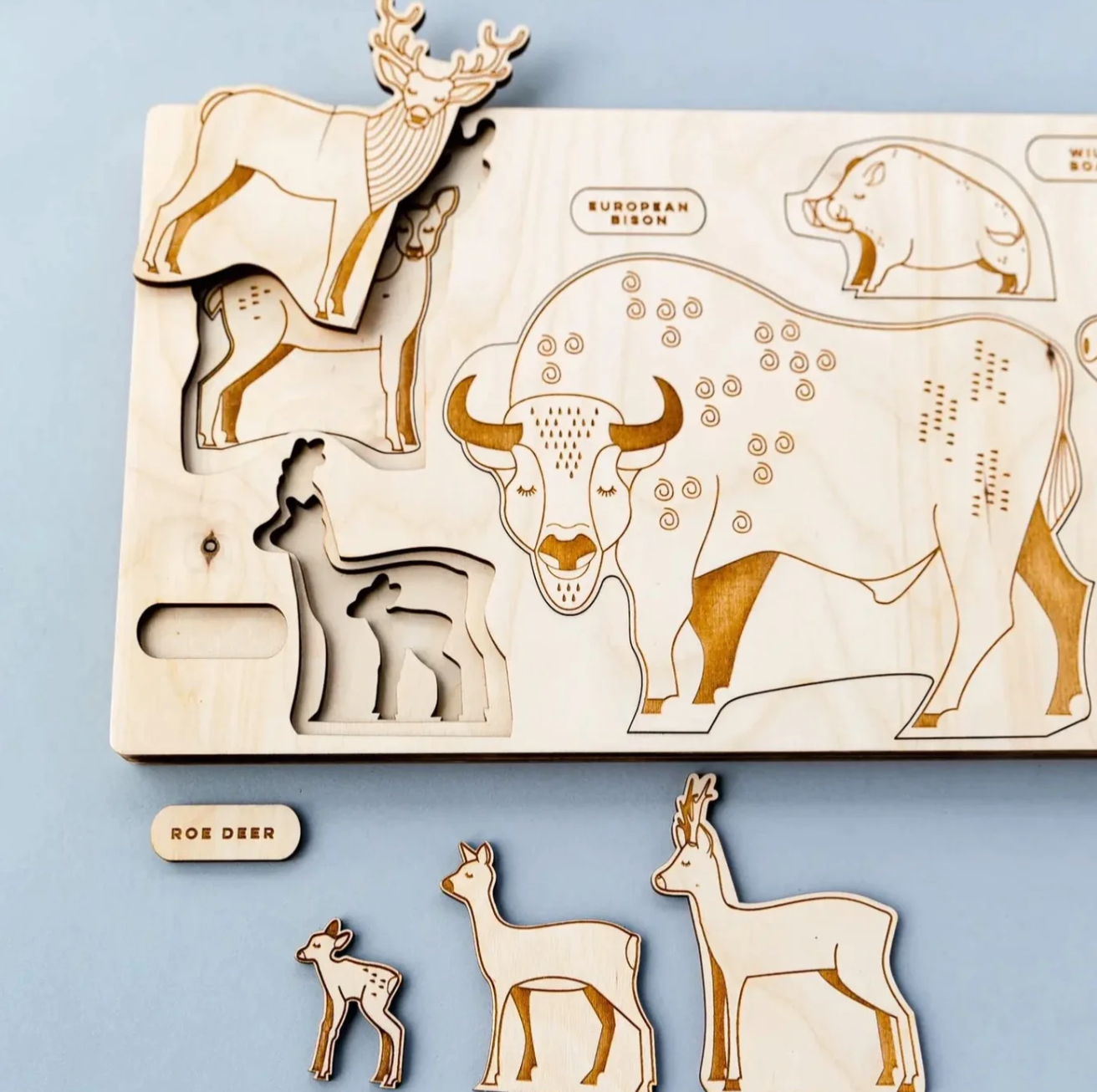 Who lives in the forest? Let's go explore with this beautiful hand-crafted Forest Animals Wooden Puzzle. Three layers, 20 puzzle elements and tons of educational play! Discover the different animals that live in the forest, match their correct names and learn how they grow.