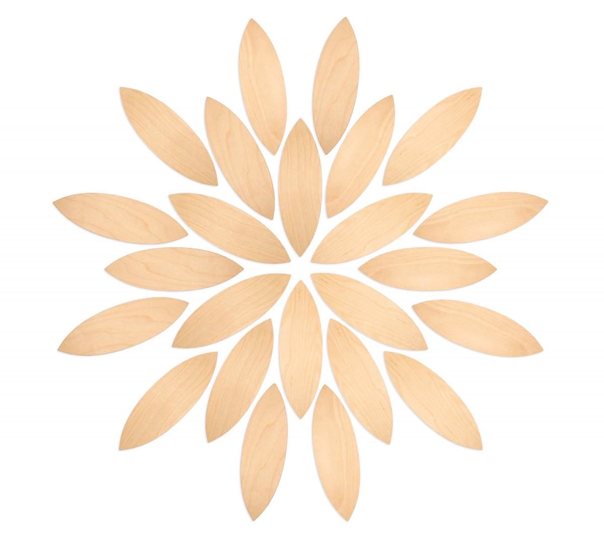 24 flat plywooden pieces in the shape of flower petals (290mm x 90mm x 9mm).