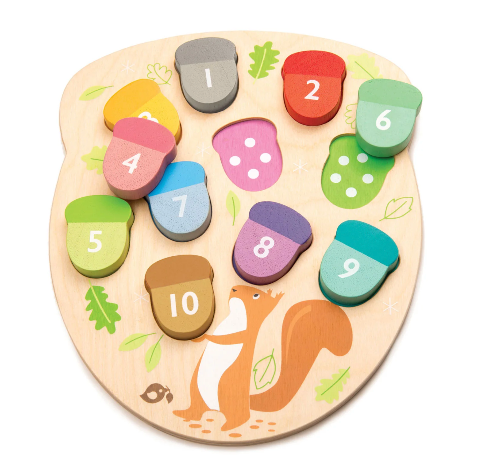 Can you help the little squirrel to count all the acorns? Learn numbers and colors with this brightly colored acorn set is great fun. This set includes 10 colored wooden acorns each revealing the corresponding colour and number of dots.