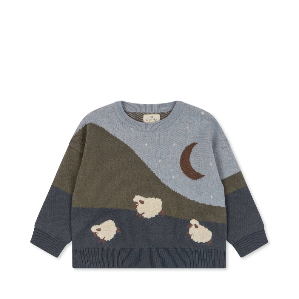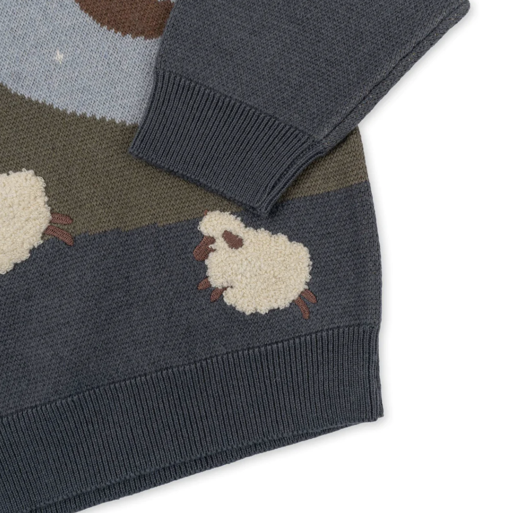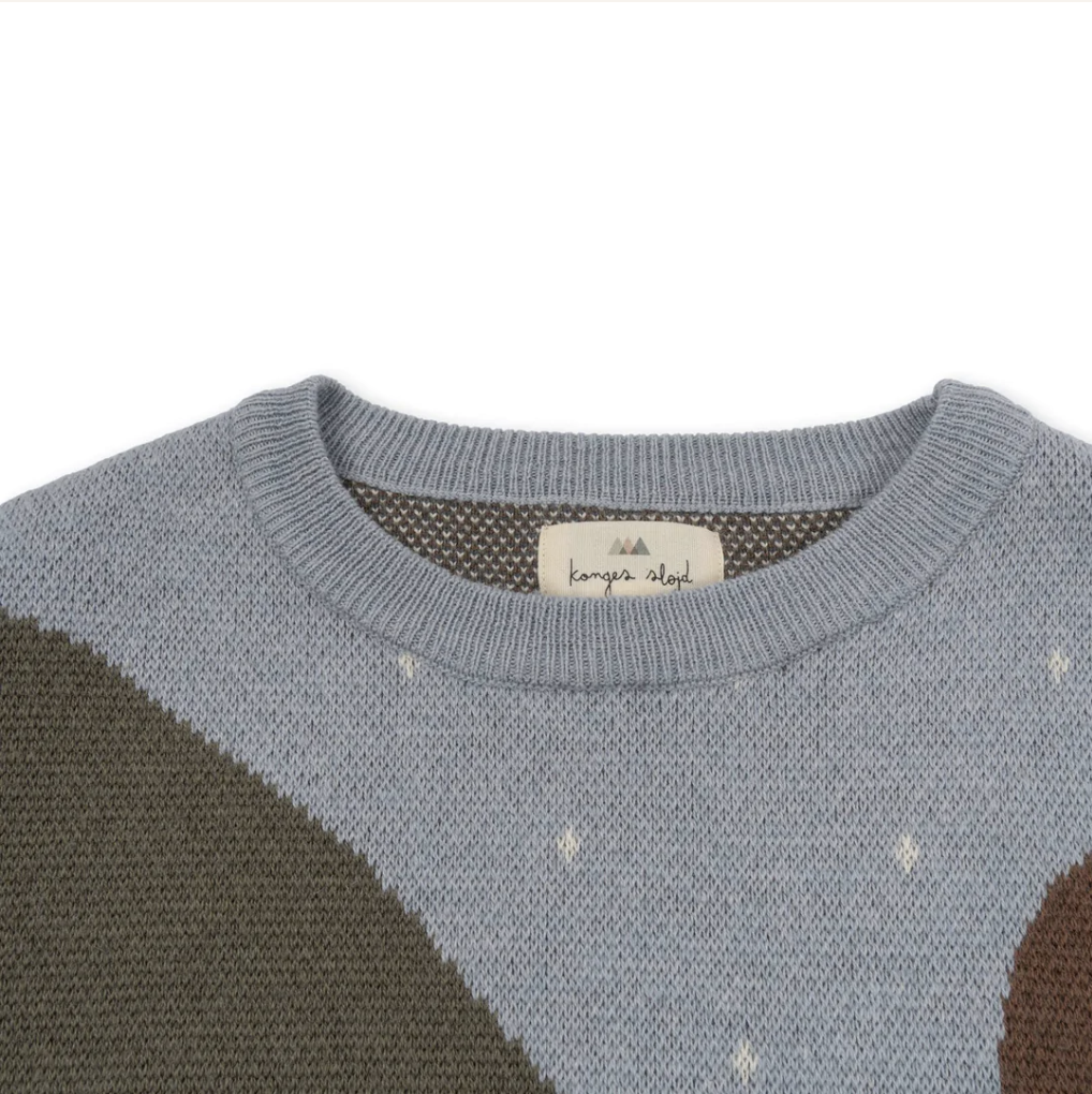 Soft jaquard knit blouse made in 50 percent organic cotton and 50 percent wool. Designed with ribbed endings and slightly dropped shoulders for a relaxed fit.