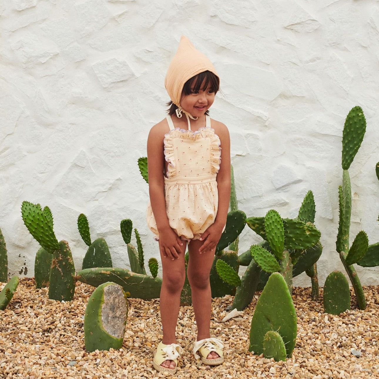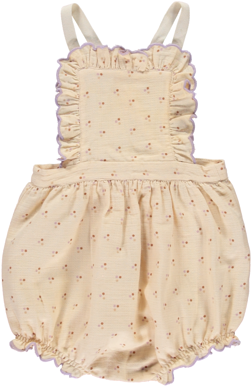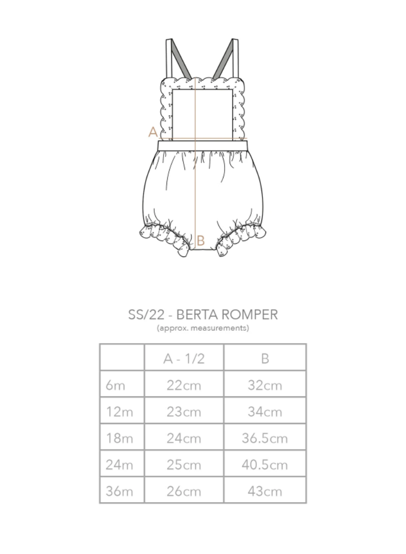 The Berta Romper is easy to put on and off. It comes in a wide cut with elasticated parts on the back waistline. It has thin shoulder straps. It has wide harringbone tapes as shoulder straps, which can be adjusted in the back.