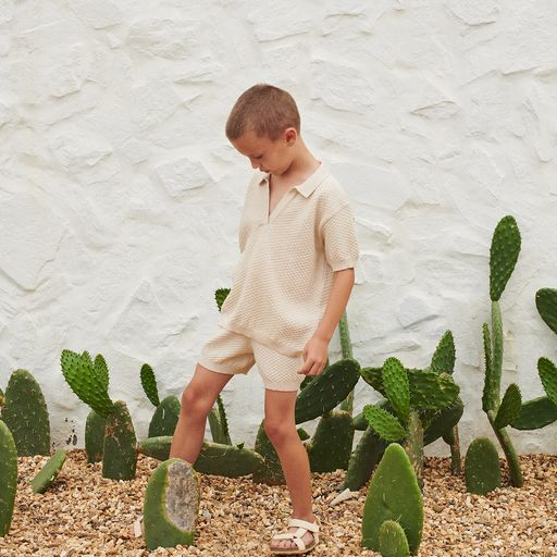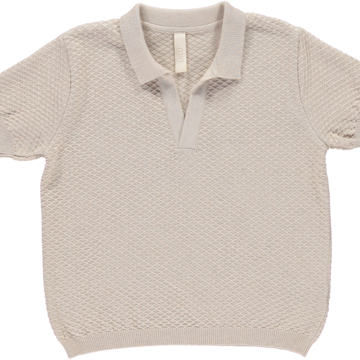 The Knit Polo has a loose fit with an open V-neck collar, short sleeves and stronger knitted hems on sleeves and bottom.