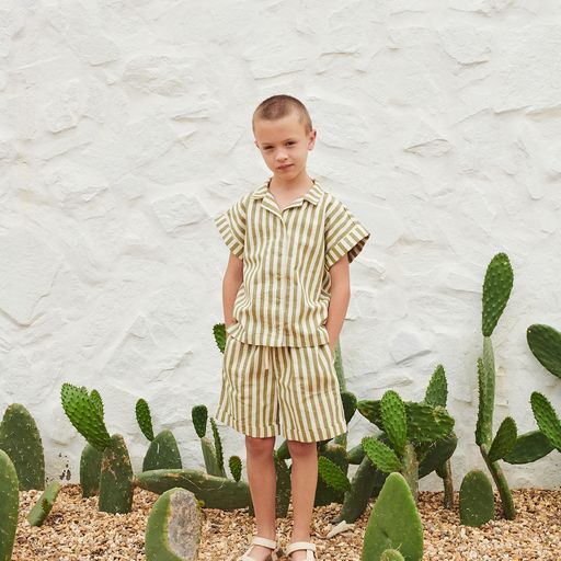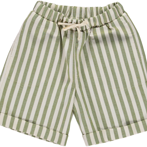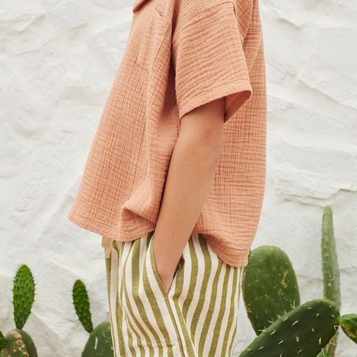 The Bermuda Shorts in this seasons stripes pattern have a nice loose fit with an elasticated waistband which can be adjusted in the front thanks to herringbone tapes. It has big side pockets to collect all those little treasures.