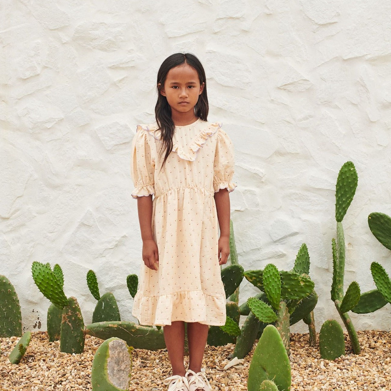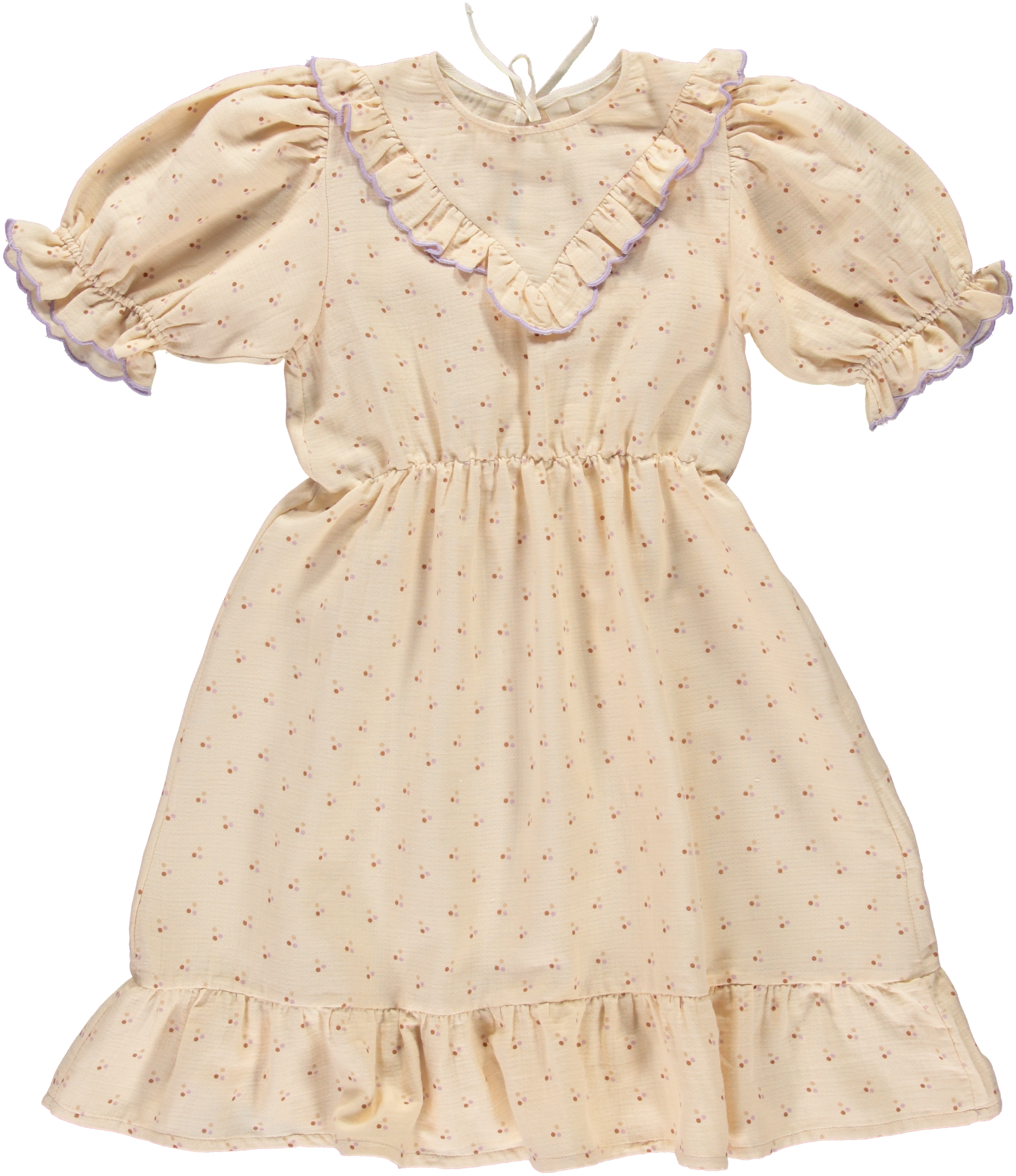 The Toni Dress has a round neckline hold together with herringbone tapes to be closed in the back. The short puffed sleeves are ruffled together with little ruffles around the ending. It has a ruffled V-part optic on the front. With its gathered waistband it shows a nice silhouette and gives some width to the bottom part. The bottom has a volant for detail.