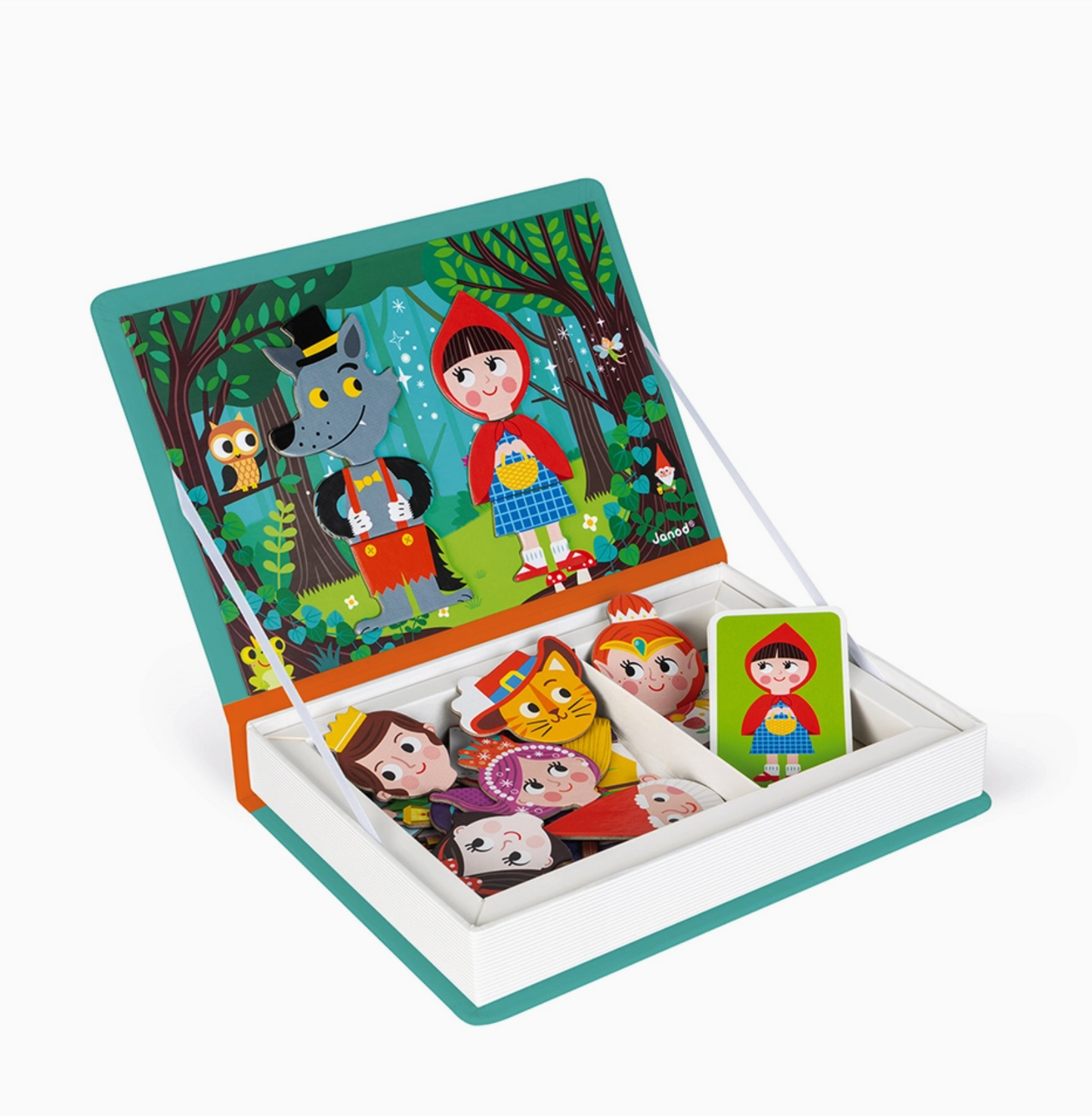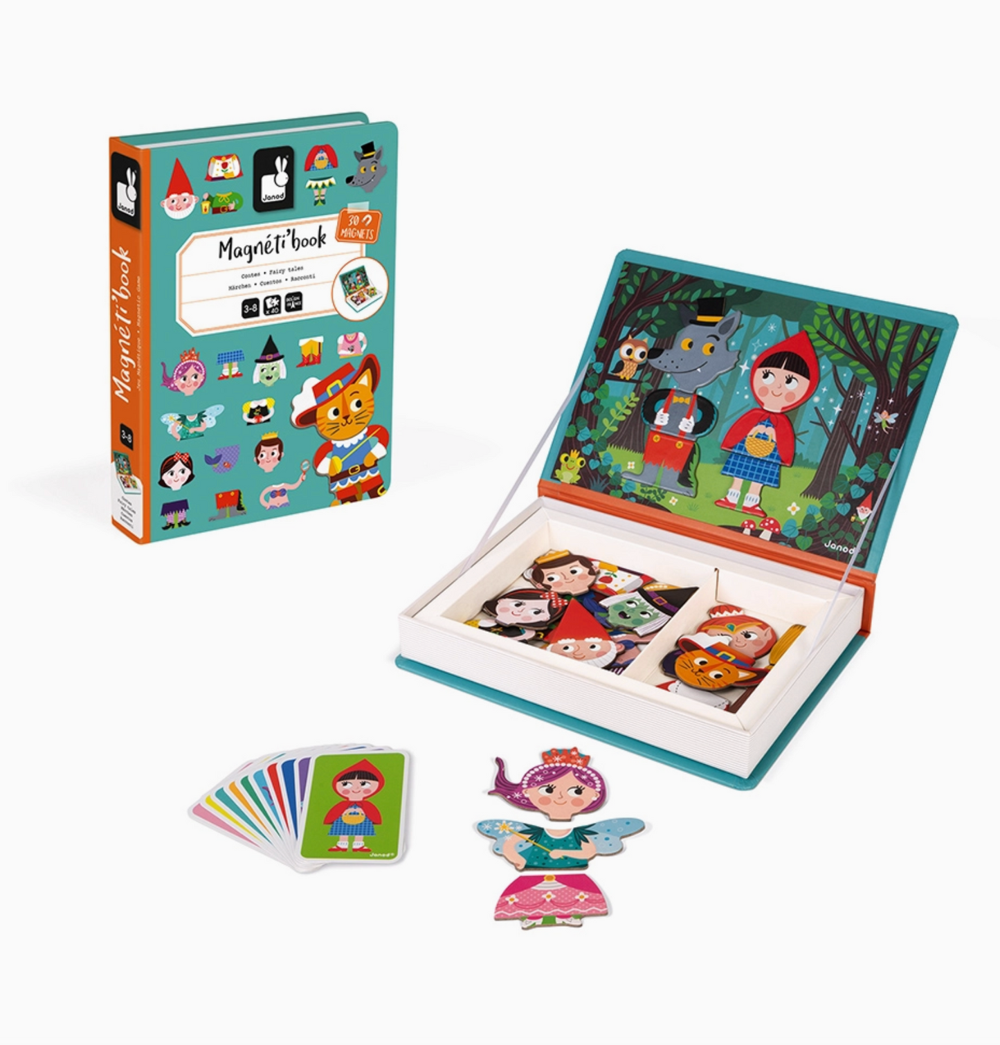 Cardboard magnetic educational game based on the theme of fairy tales, composed of 30 magnets and 10 cards. Once the book is opened, the object of the game is to use the magnetic background for the placement of magnets to recreate the fairy tale character indicated on the card. Children can also have fun mixing the various interchangeable pieces to create zany characters