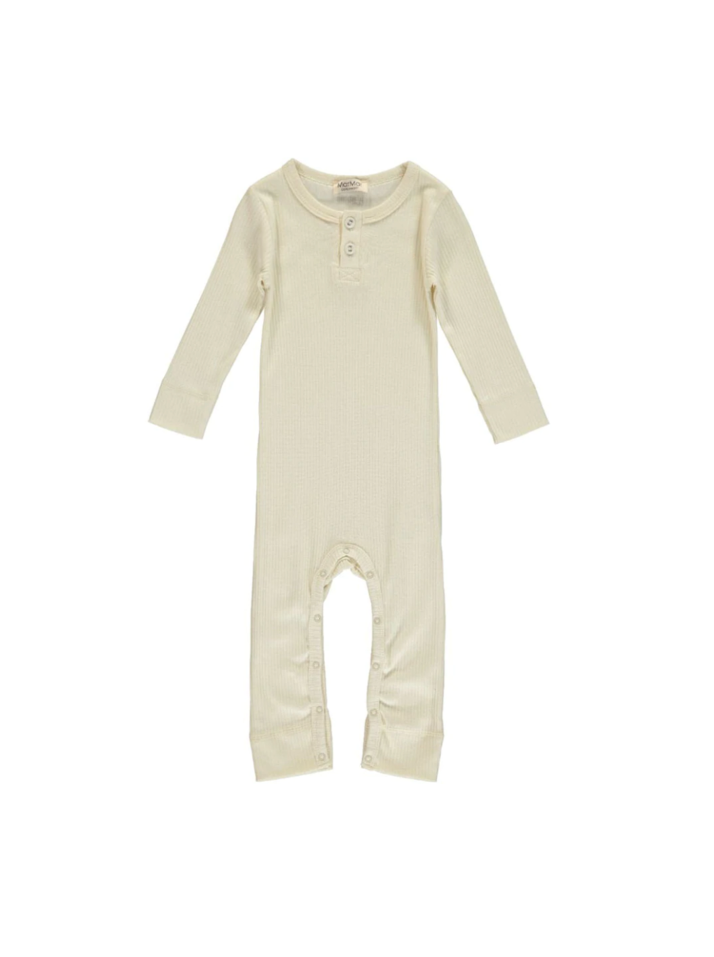Long-sleeved romper with bottons, with snap bottons on the left shoulder and at the crotch for easy changing.