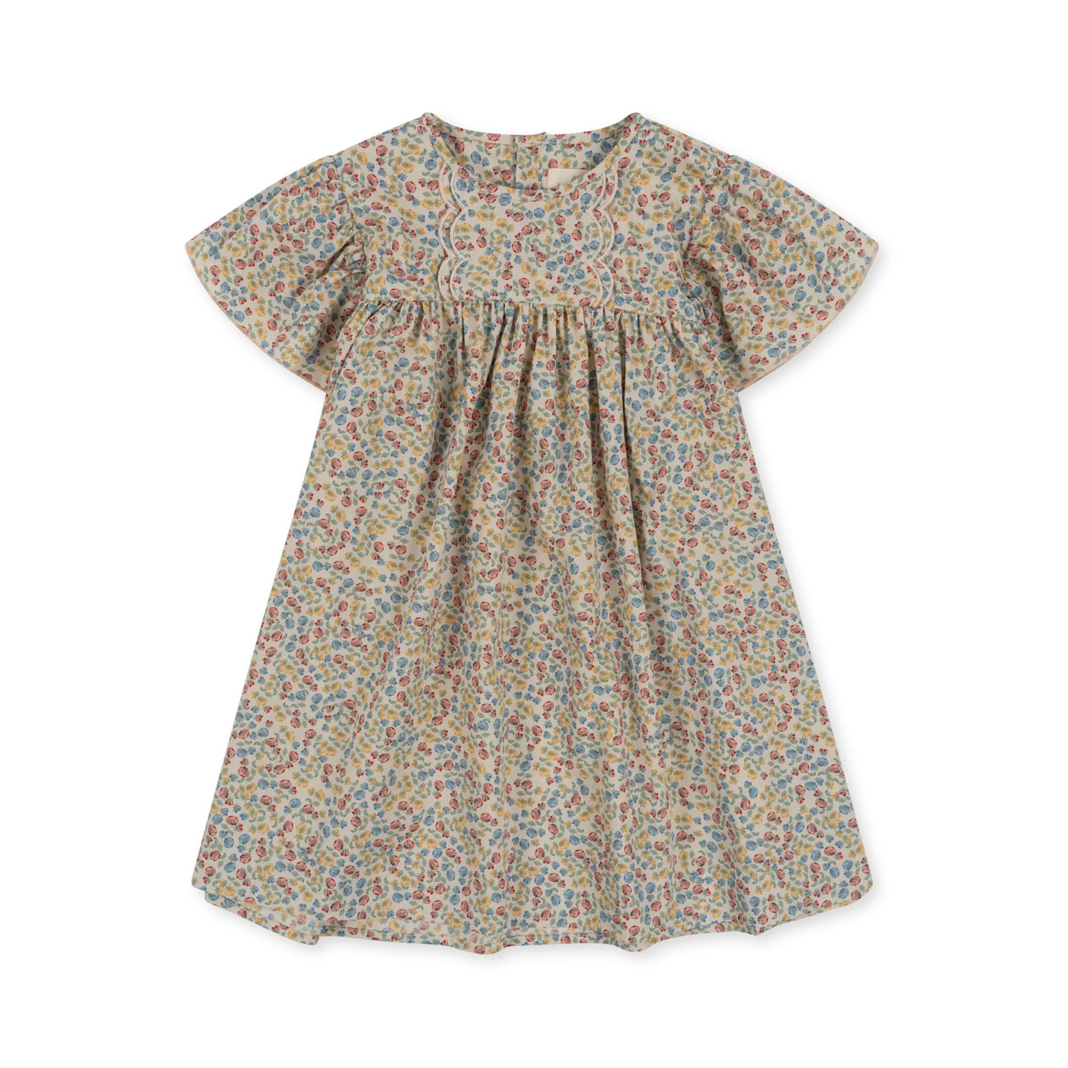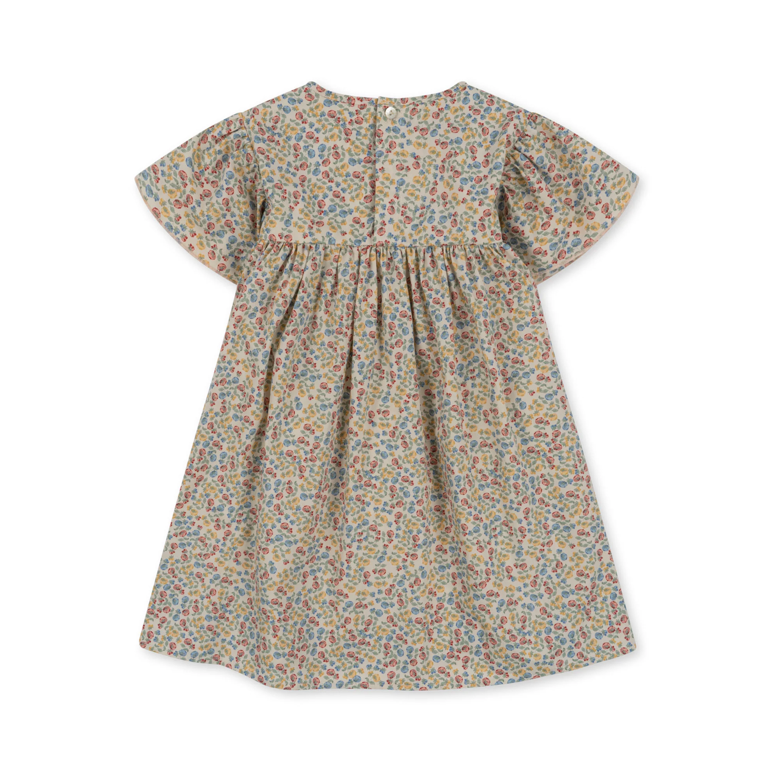 Dress made in 100 percent organic cotton designed with a flared cut, puff sleeves and elasticated frill cuffs with baby lock endings. Closes with a single mother of pearl button at the back neckline.
