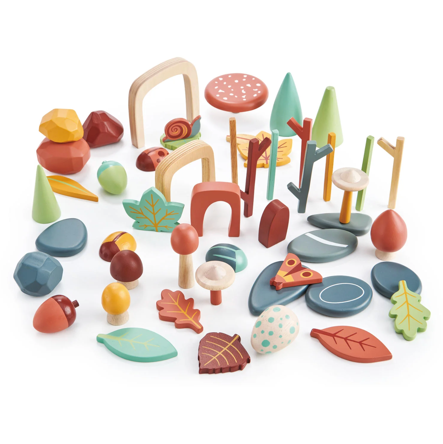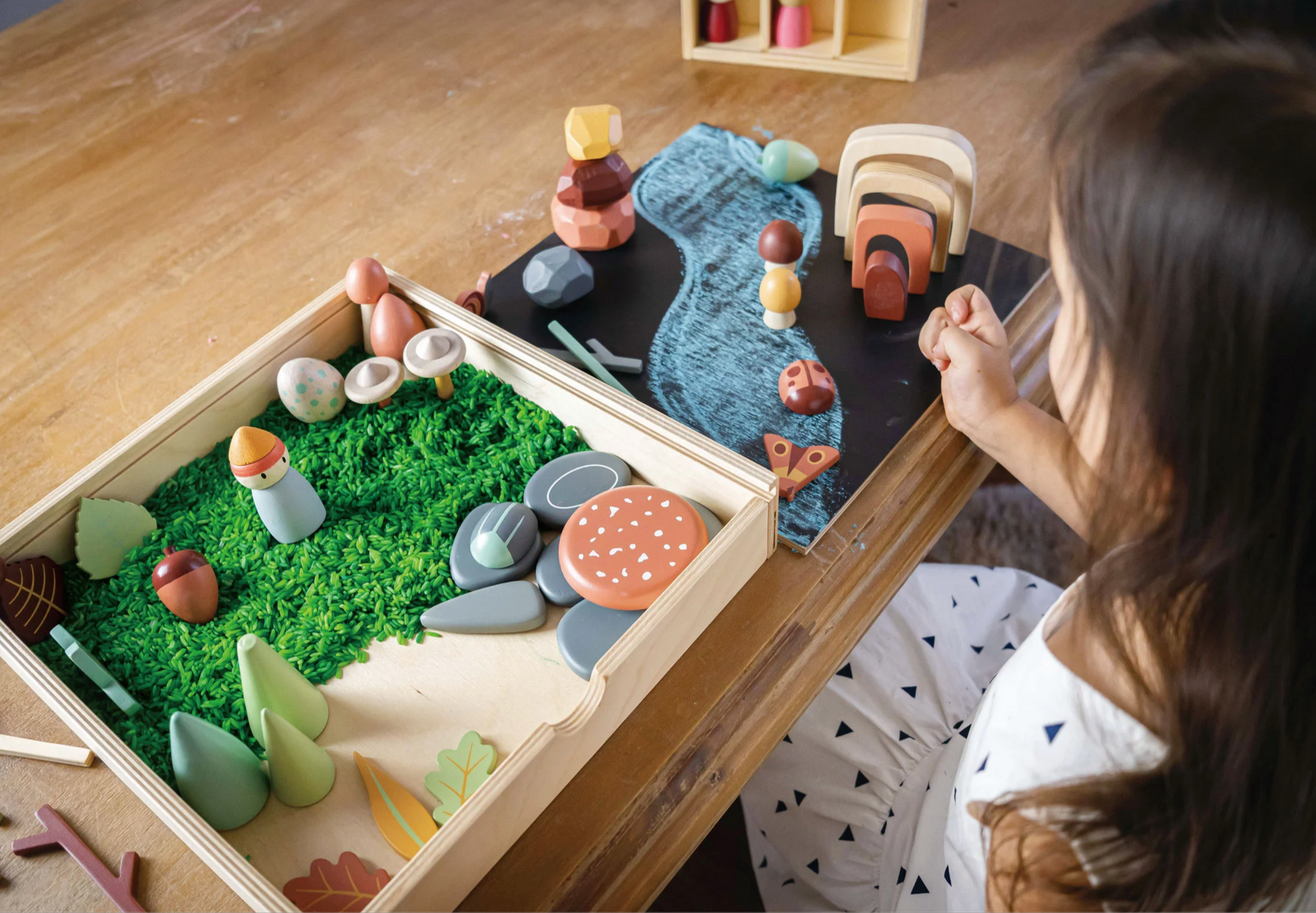 An extensive open-ended play tinker tray box for your little one to sort, stack and arrange their woodland treasures. The lid is removable and can be turned around and used as a chalkboard on which to create your forest floor. The wooden compartments can also be removed and the box filled with sand to create a magical woodland play scene. Set includes: 6 grey flat pebbles, 4 multi-faceted rocks, 3 cone trees, 8 twigs, a snail, a moth, 6 little toadstools, a large toadstool, 10 leaves, 2 acorns, 3 beetles, 4 tunnel pieces, and a bird‘s egg.