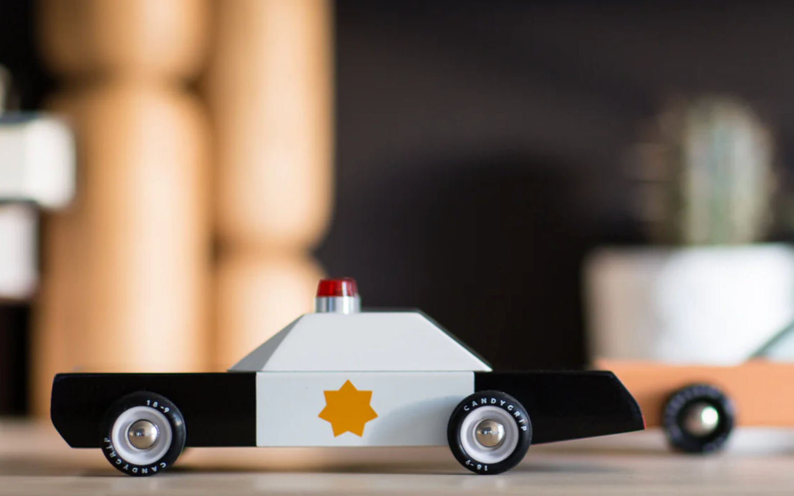 Boxy and assertive, shiny black-and-white paint scheme, gold star and with two cherries on top. Making sure racing stays at the track. Not for children under 3 years of age.