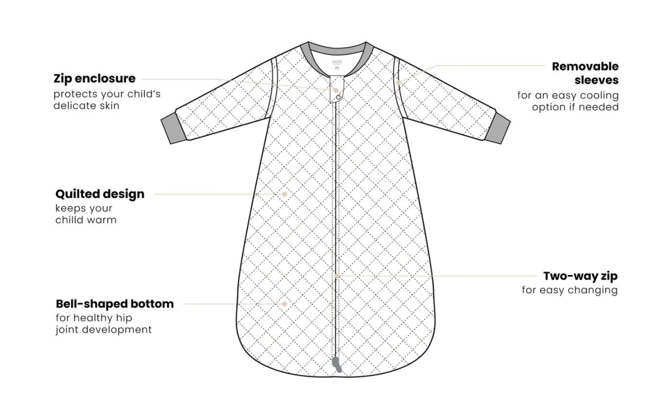 Designed for ultimate coziness, your sweet bub will enjoy an uninterrupted slumber snuggled in this quilted sleep bag. Made with our breathable and soft blend of bamboo and cotton, it's also insulated with Sorona filling for plushy softness and warmth. As seasons and temperatures change, our removable sleeves will ensure your little one stays comfortable at any time of year.