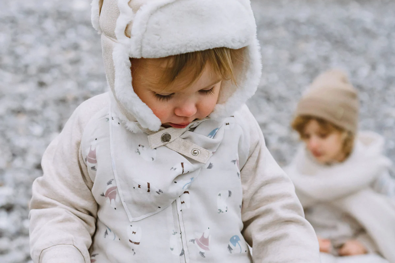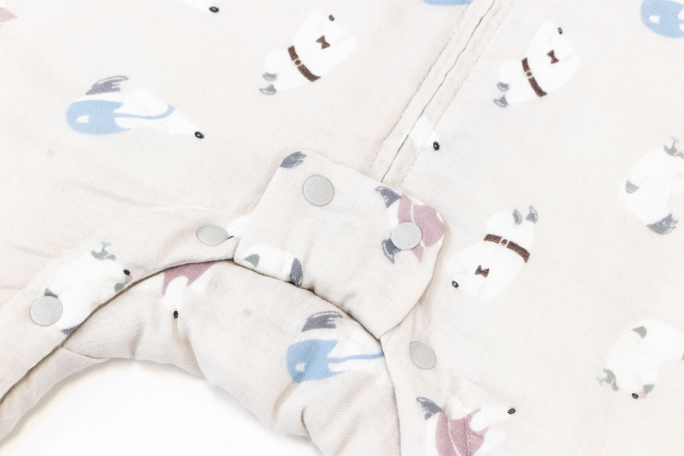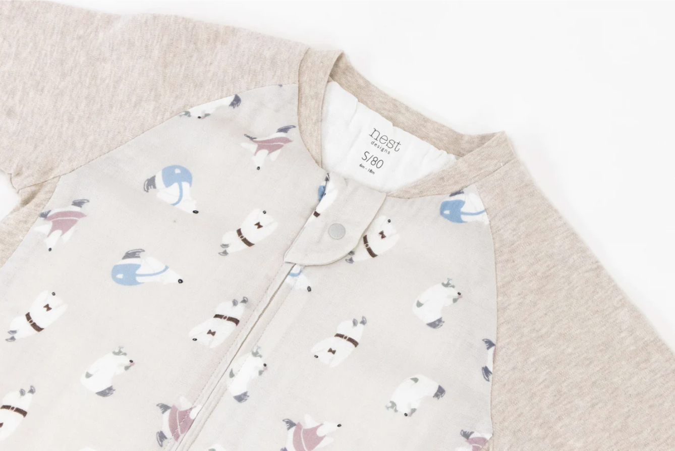 Keep your baby cozy and warm in our long sleeve footed sleep bag in our adorable Rainbow Swim print, a part of our FW22 collection. Made with our unique bamboo blend with wool and with a Sorona® fill, this footed sleep bag is perfect for the fall and winter. Sorona® is an eco-friendly, fully biodegradable filling used to insulate our sleep bags and give it a light, plushy softness. This footed sleep bag has a 2-way zip for easy diaper changes and foot cuffs that fold over your baby’s feet to keep them warm at night. The stretchy side panels allow your bubs to move with ease, whether in or out of bed. Our footed sleep bags are a favourite for toddlers on-the-move and perfect for the transition between a sleep sack and using a big kid blanket.