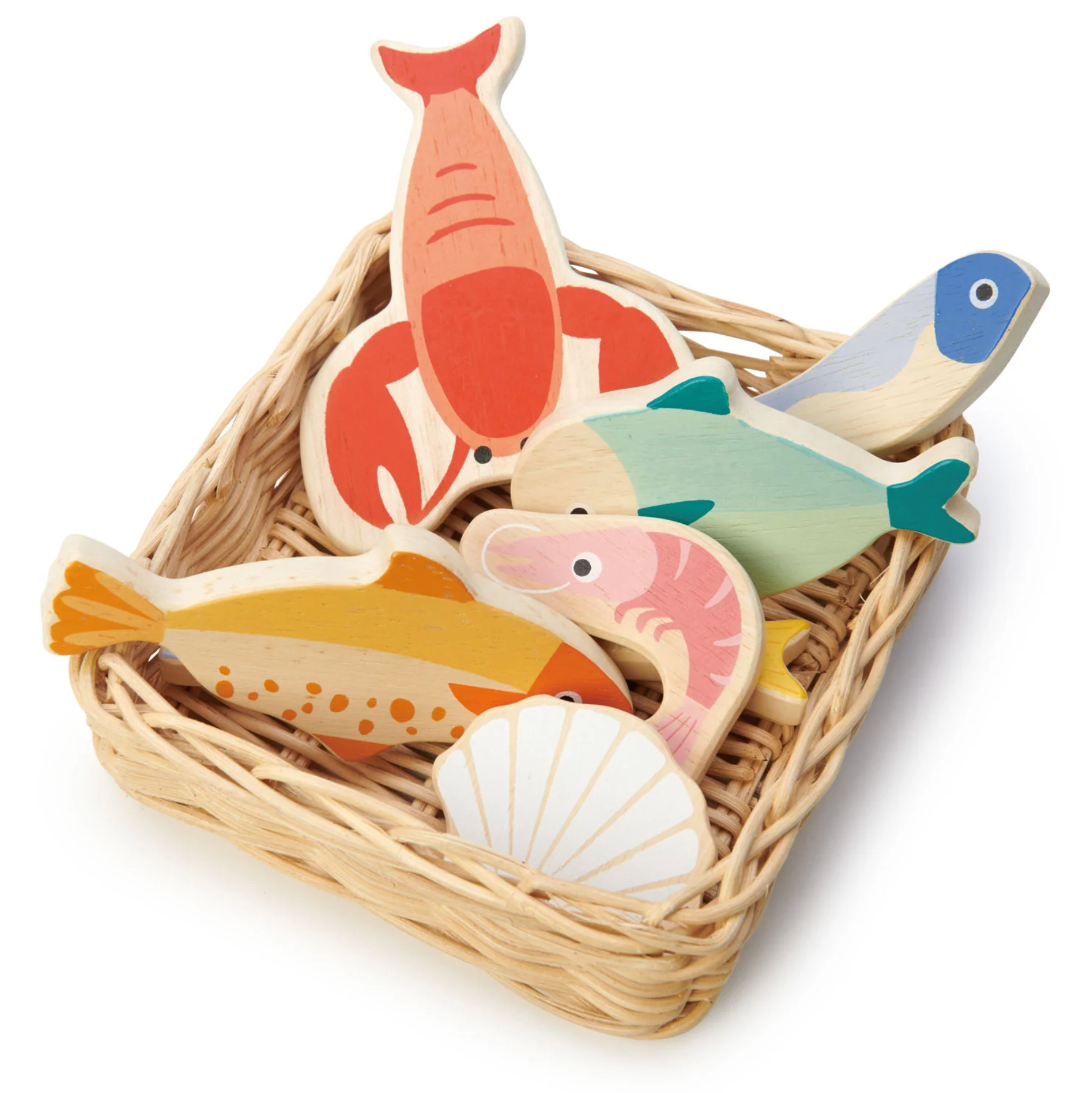 A handcrafted wicker basket with wooden lobster, butterfish, mackerel, herring, whitebait, prawn and scallop.