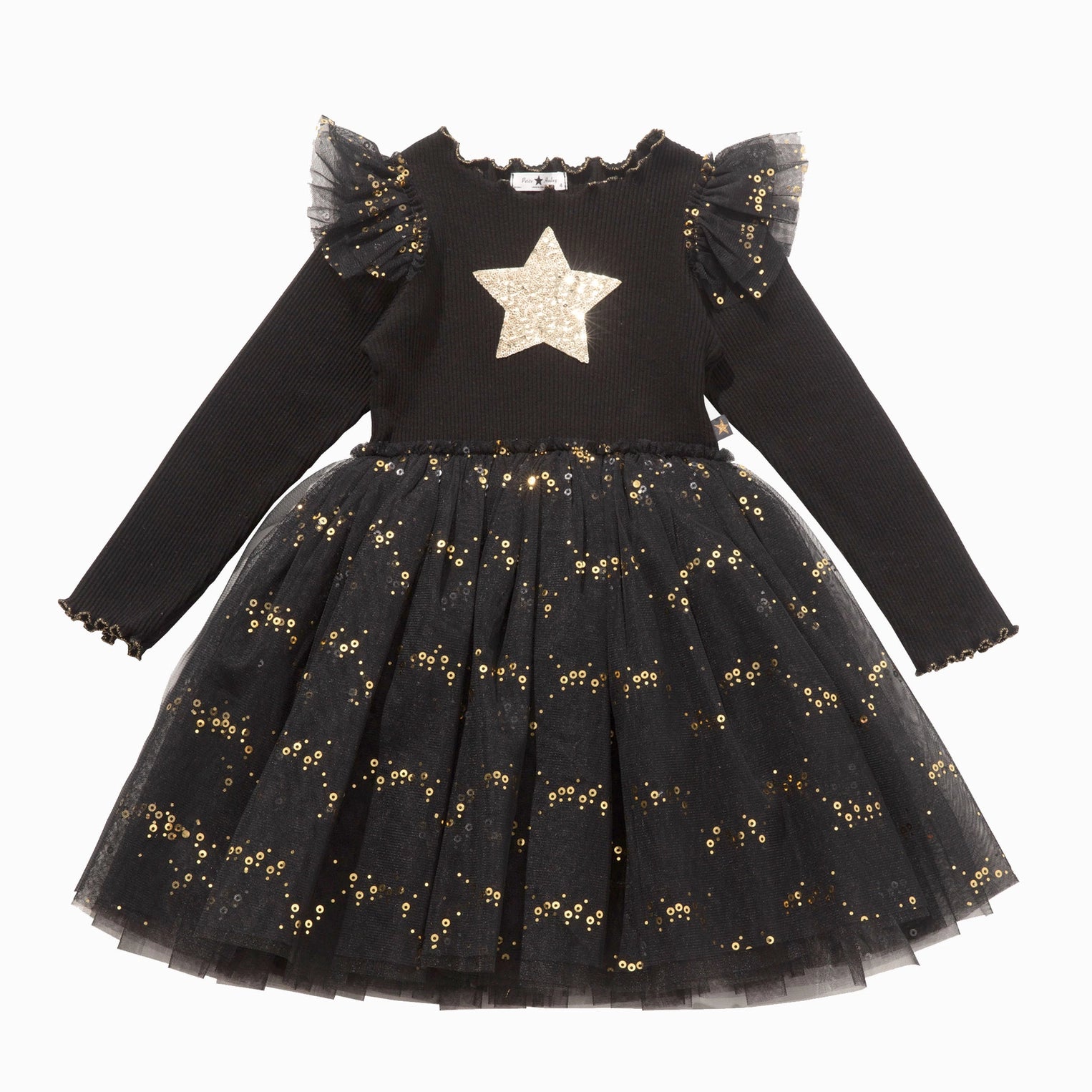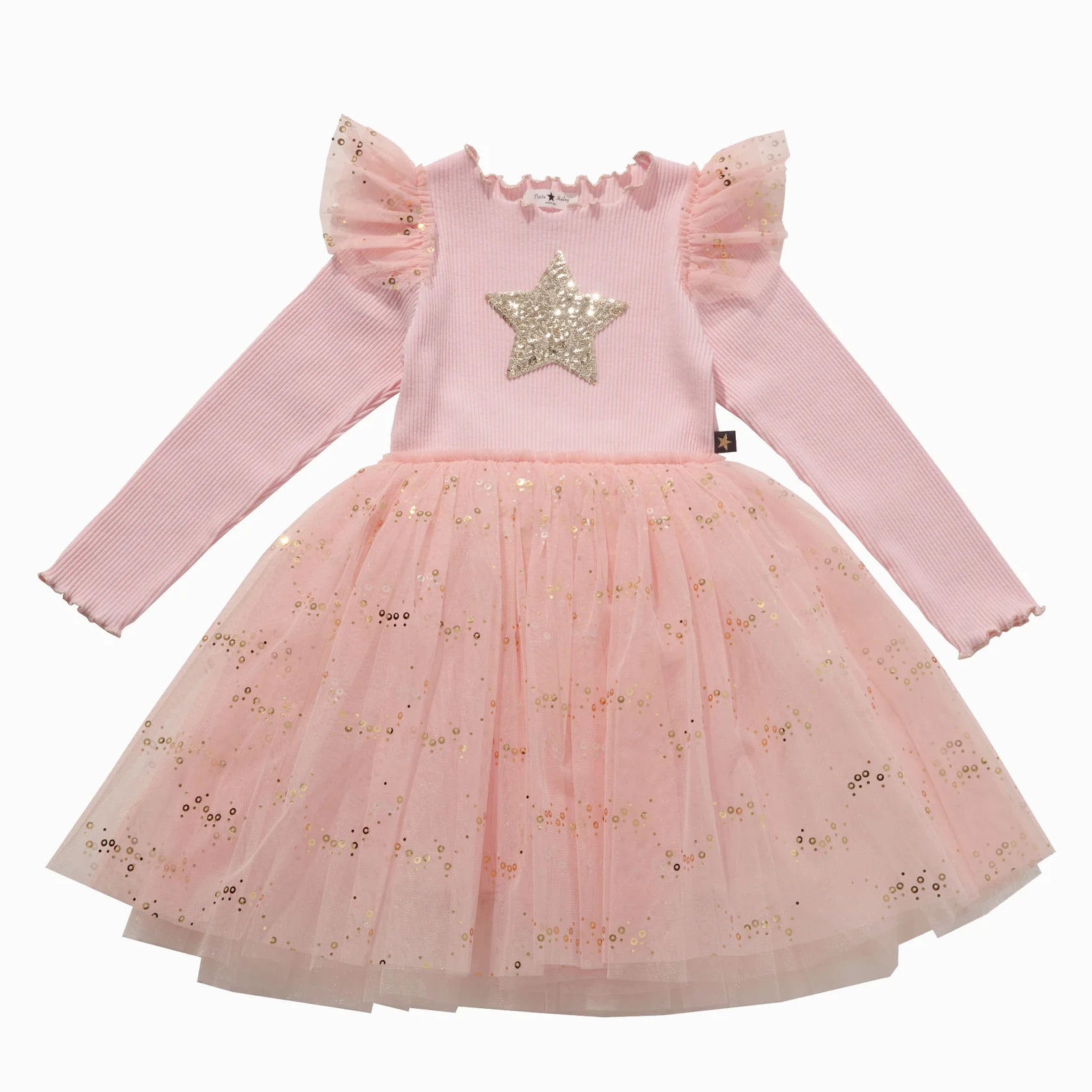 Enhance your child's wardrobe with our luxurious Star Frill Tutu Dress. The soft ribbed fabric and adorable shoulder frills provide comfort and style. The sequin tulle skirt adds a touch of shimmer, perfect for any occasion. Complete the look with our Glitter Star Small Clip, Jelly Tote and Patent MaryJane Shoes for a polished and elegant ensemble.