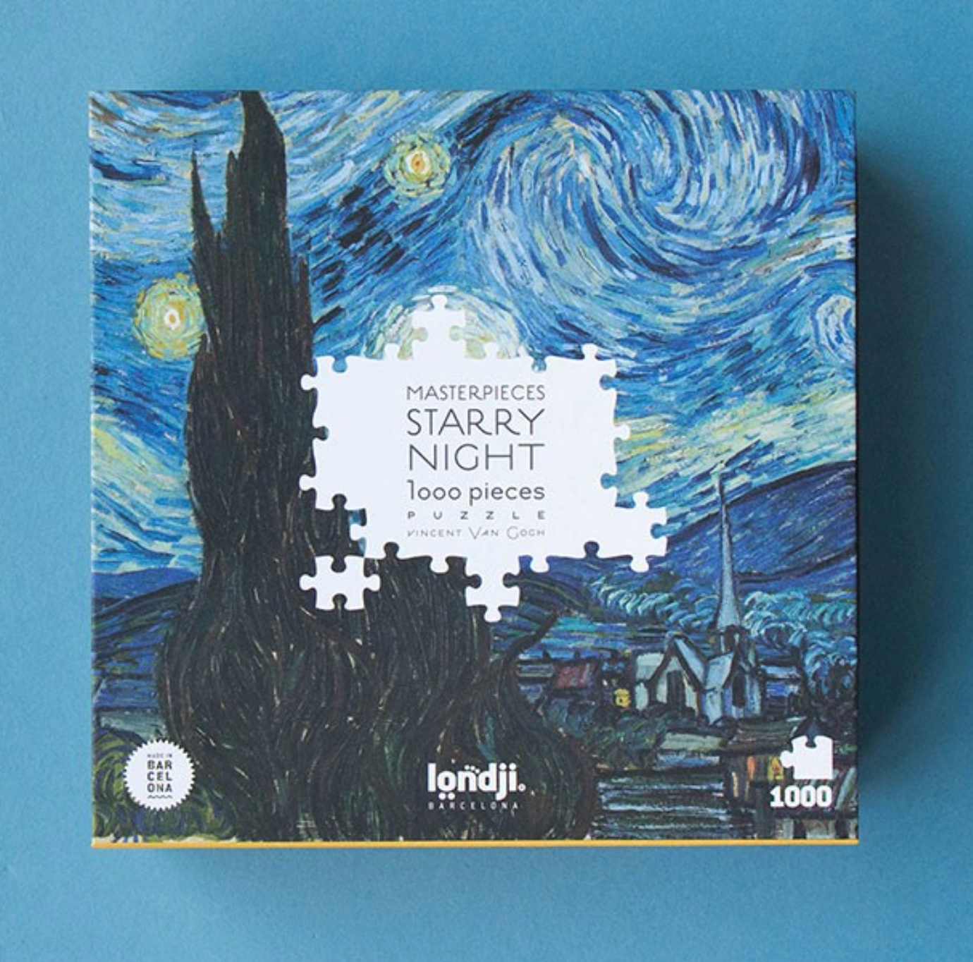Starry Night, one of the famous paintings from Vincent Van Gogh, in 1000 pieces for little ones and adults' happiness. The puzzle comes in a cotton bag and is made out of recycled cardboard and paper.