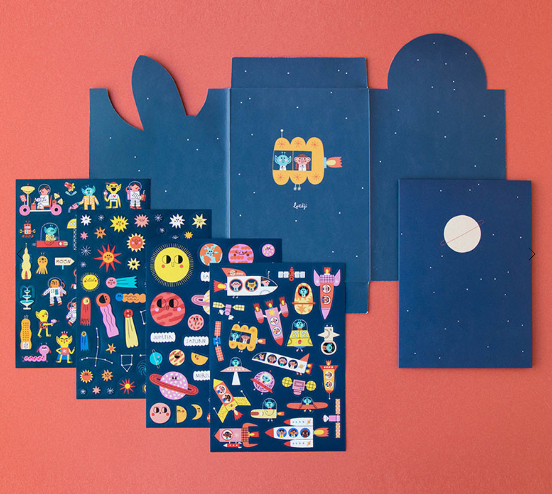 The game includes 150 space stickers that can be reattached as many times as you like. They include stickers of rockets, aliens, satellites, planets, constellations and many different stars so you can build your galaxy in your favorite setting!