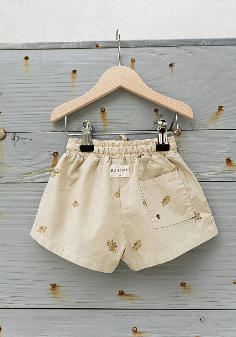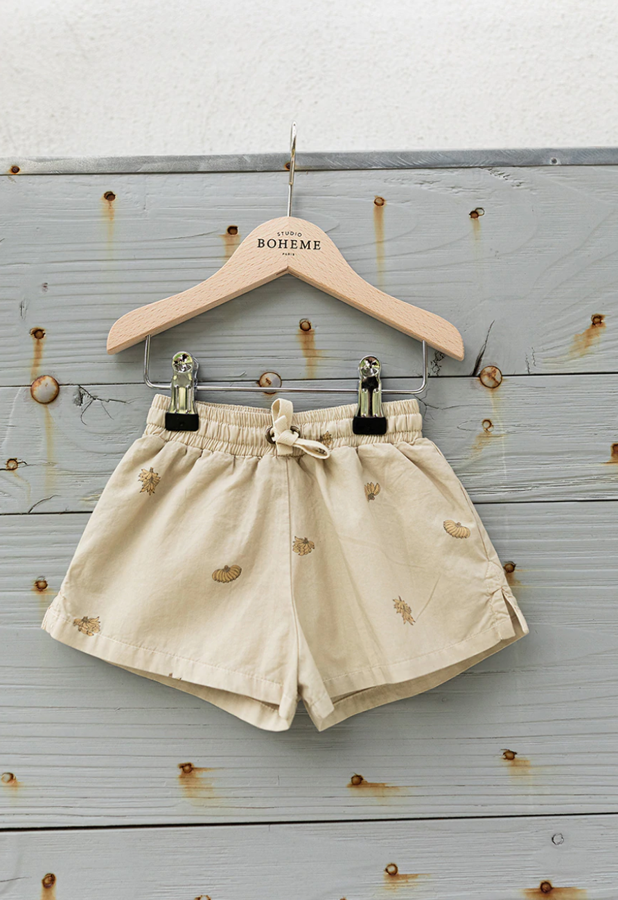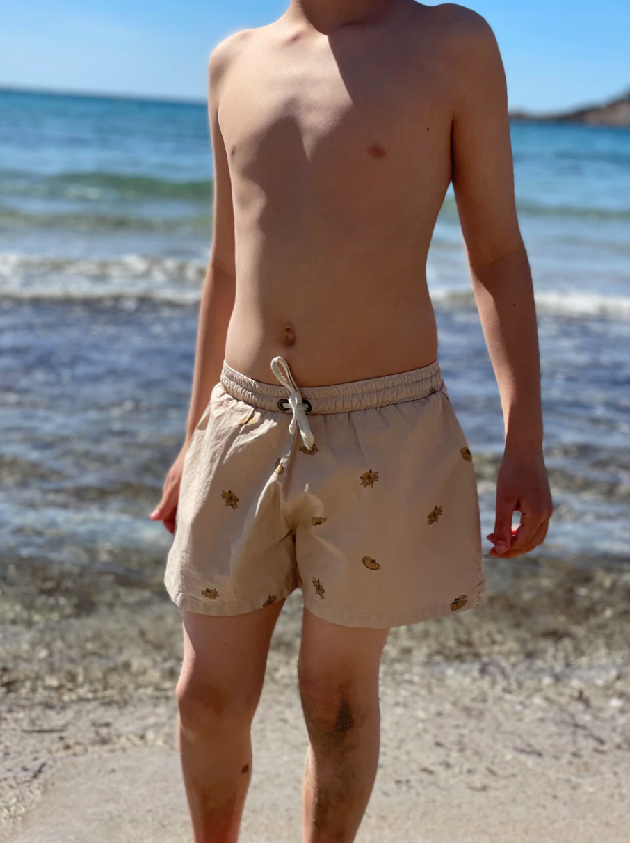 Printed swim shorts in organic cotton poplin. Back pocket. Elasticated waist with drawstring. Mastic beige or latte (light pinkish brown) background with banana print. Studio Bohème label sewn on the back.