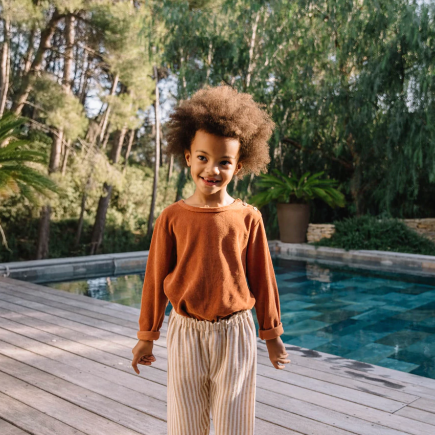 Opening at the shoulder with wooden buttons. This item is "garment dyed", meaning it is dyed once the piece is made. This specific dye brings roughness and a vintage look to the colours. The composition label will therefore also be dyed, this is not a defect.