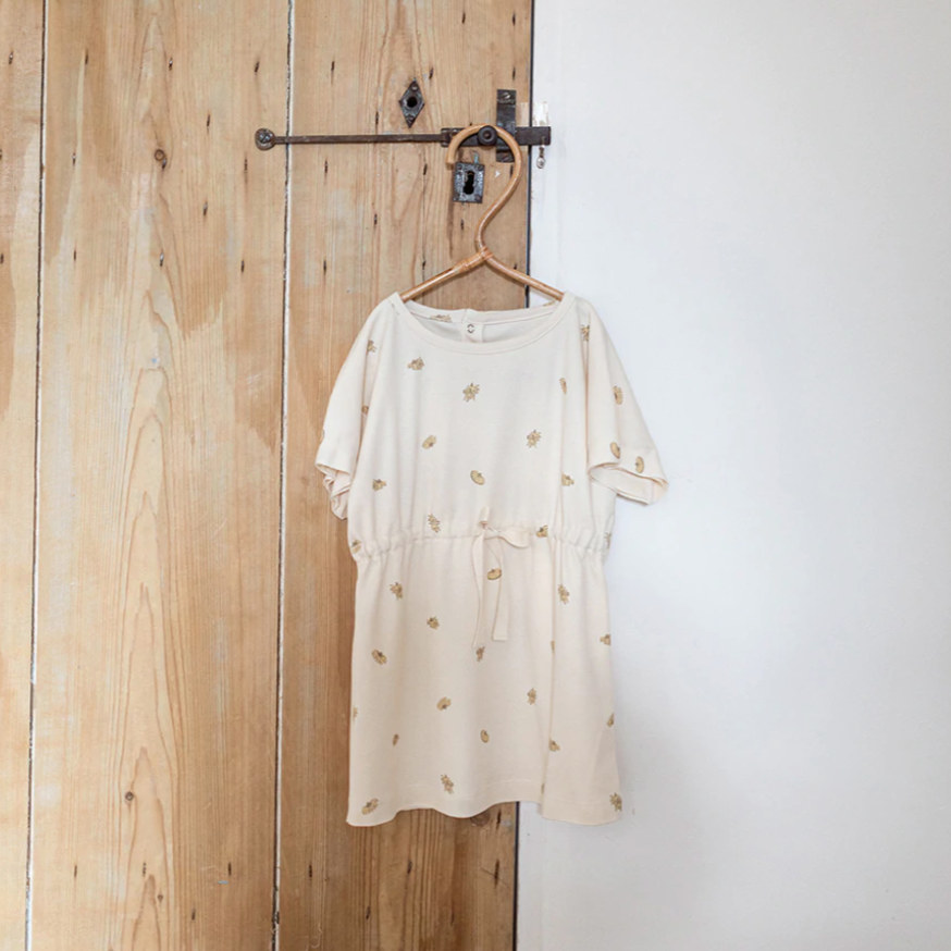 Elasticated at the waist. Decorative bow. Press studs on the back for easy donning. Ecru background with Banana print.