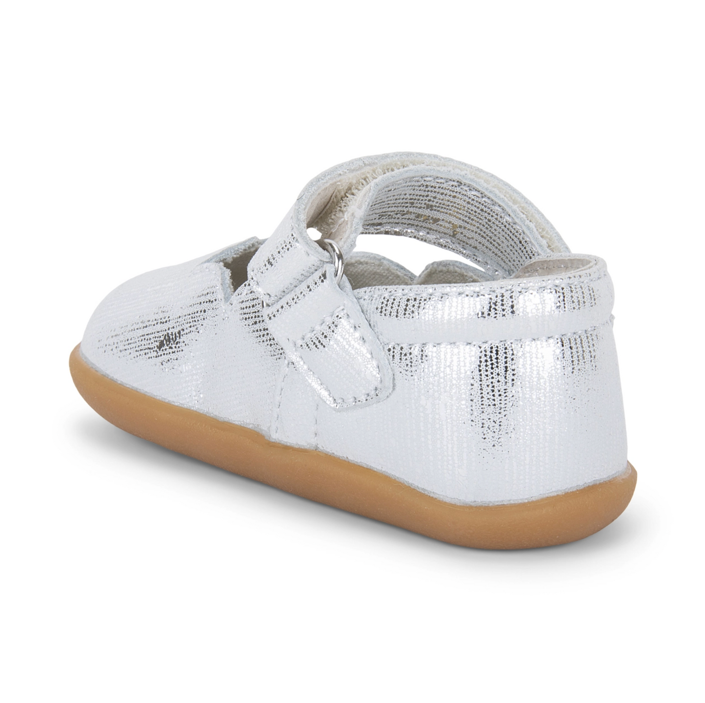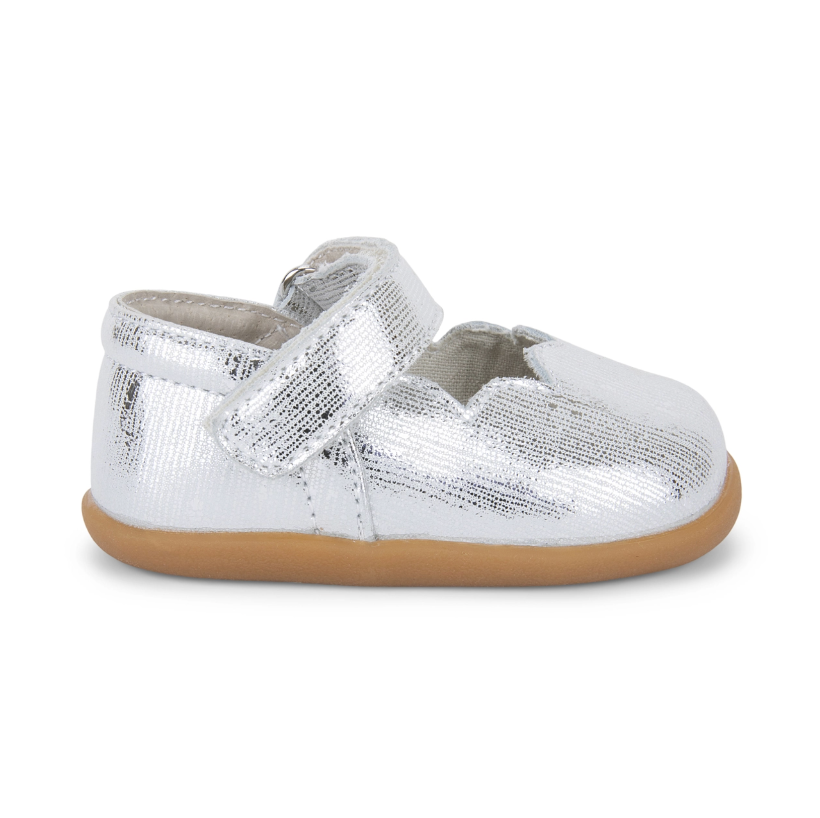 She’ll love this classic leather Mary Jane, designed for dressy occasions. The soft leather with metallic silver finish allows her to take first steps in style while the insole and padded collar provide extra comfort.