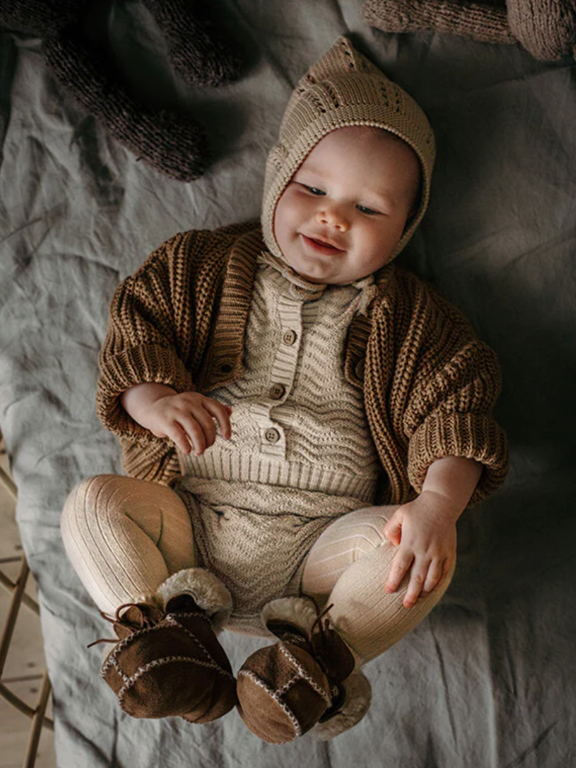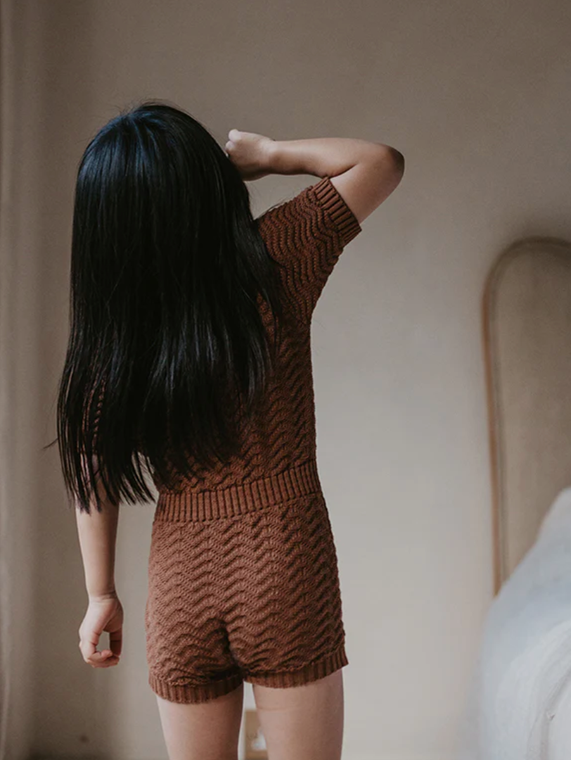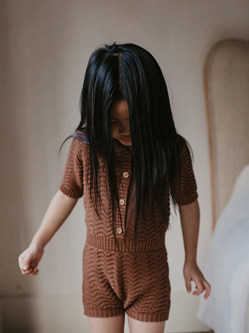 This special playsuit features our new textured chevron knit pattern, a gathered waist, and wooden buttons down the chest. Our soft, organic cotton knitted jumper is a go-to wardrobe staple that’s just as comfortable as it is charming.
