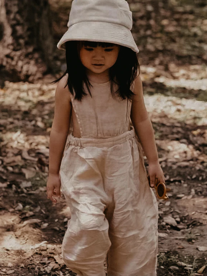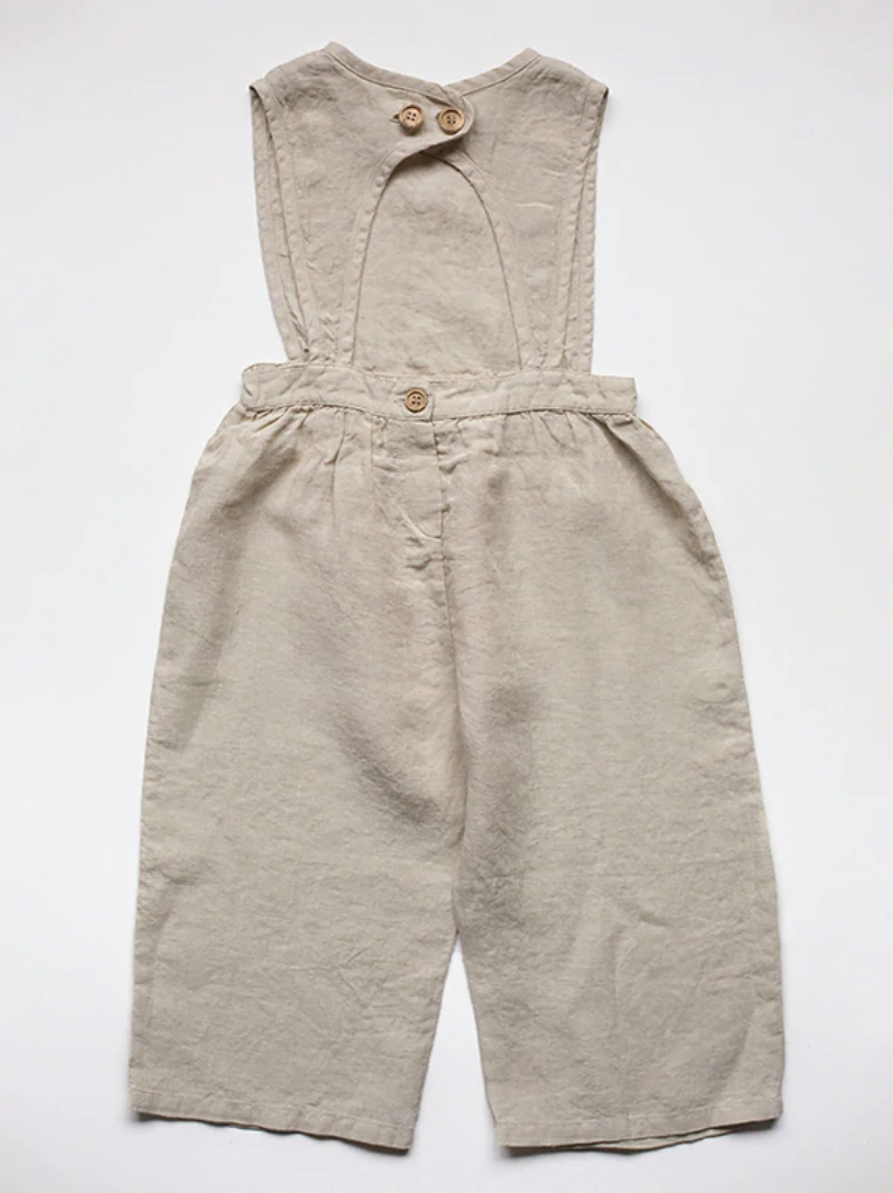 Brimming with vintage charm, our organic linen jumpsuit is the perfect lightweight summer piece. It can be worn alone or layered over your favorite top. Wide legged, with an elasticated waistband for sizes up to 2-3Y, and a waist button at the back for the rest, this playsuit is dreamy as can be.