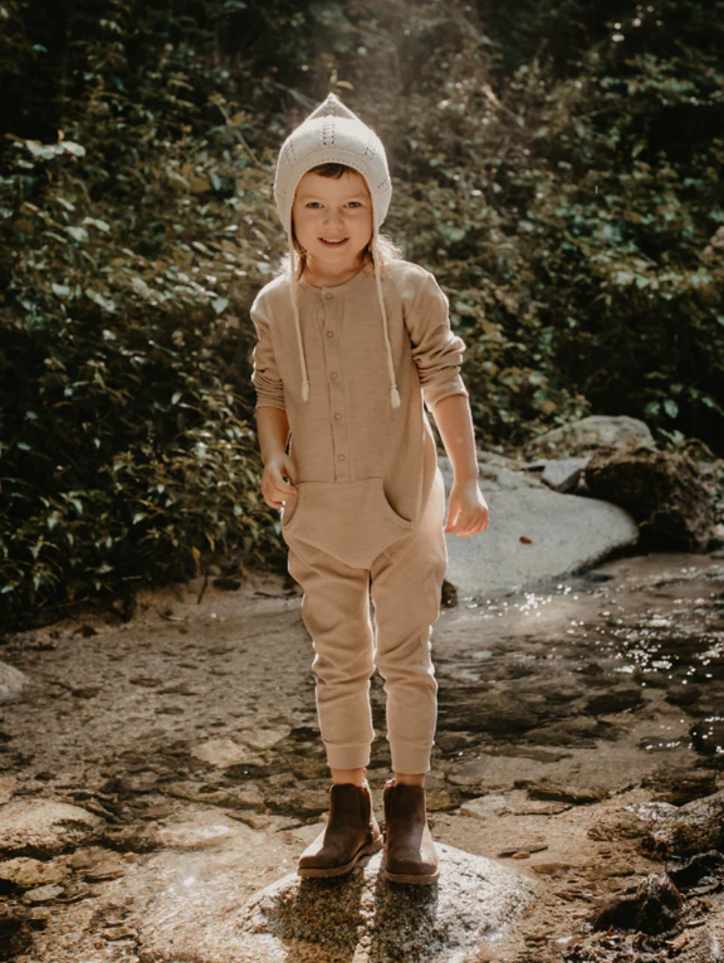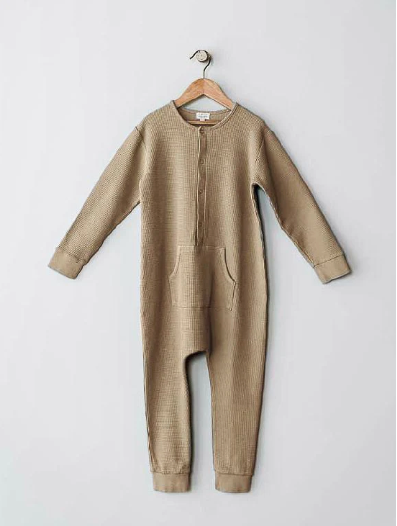 Our cozy and classic long-sleeved long john includes the throw-back features of our dreams: the softest cotton waffle fabric, a front pocket pouch, leg and wrist cuffs, and buttons down the front for easy on and off. Includes hand covers on sizes NB-12 months.