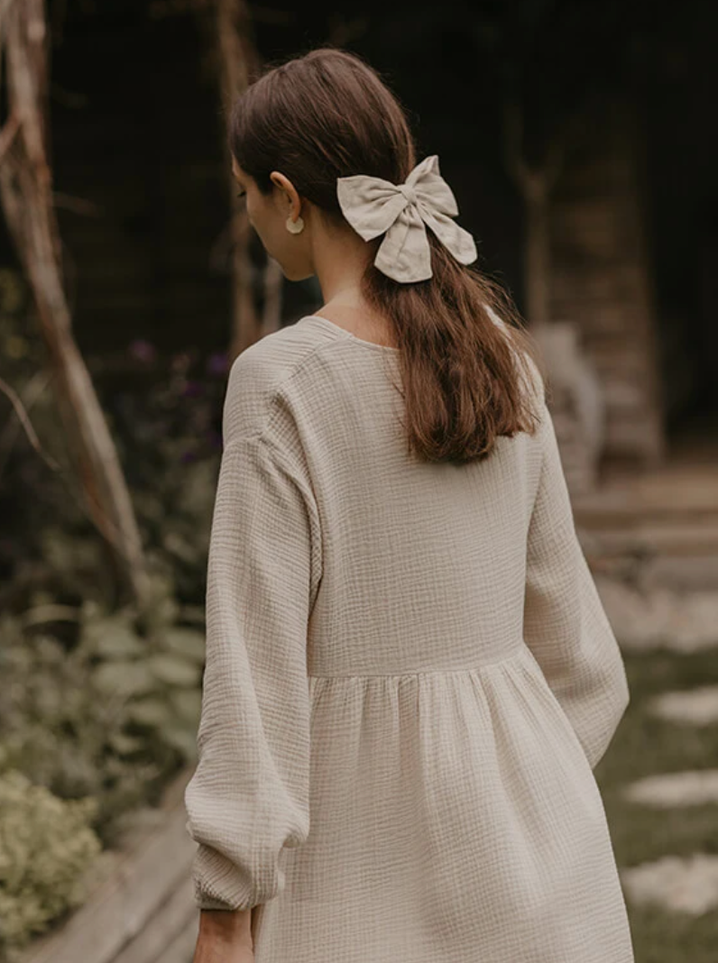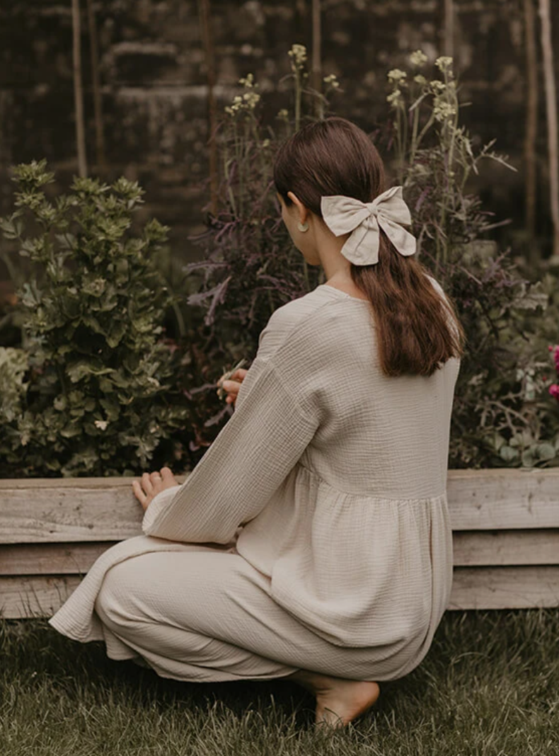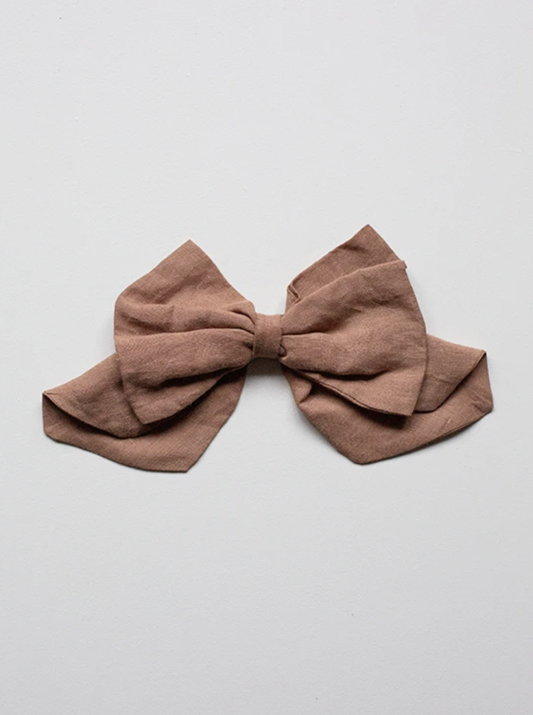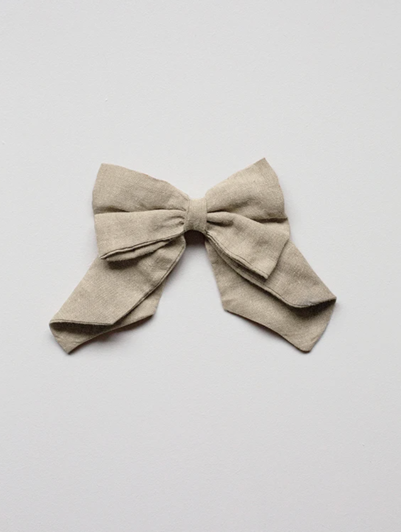 Our classic organic linen hair bow instantly adds an extra special touch of joy to any outfit. Our bow is made with an antique brass barrette and is simple to clip into short or long hair.
