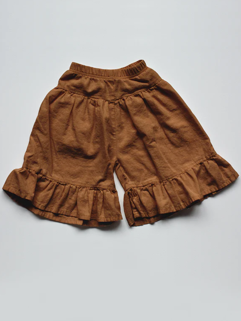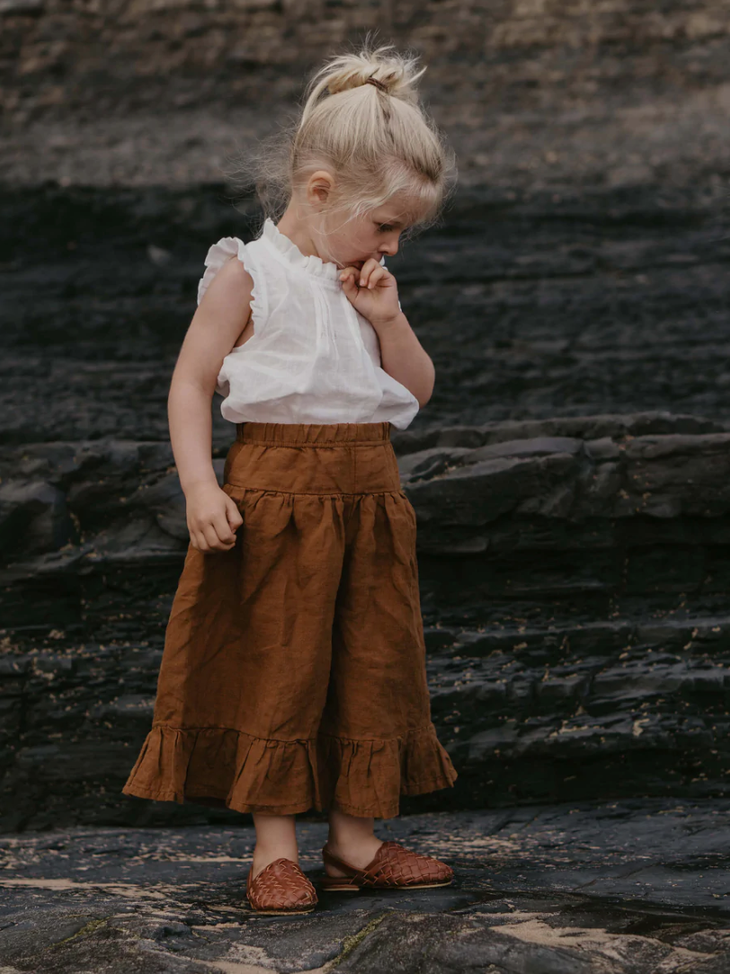 Our luxuriously soft and airy linen culotte features a gorgeous ruffle detail at the bottom of the leg and is beautifully designed for joyful play.