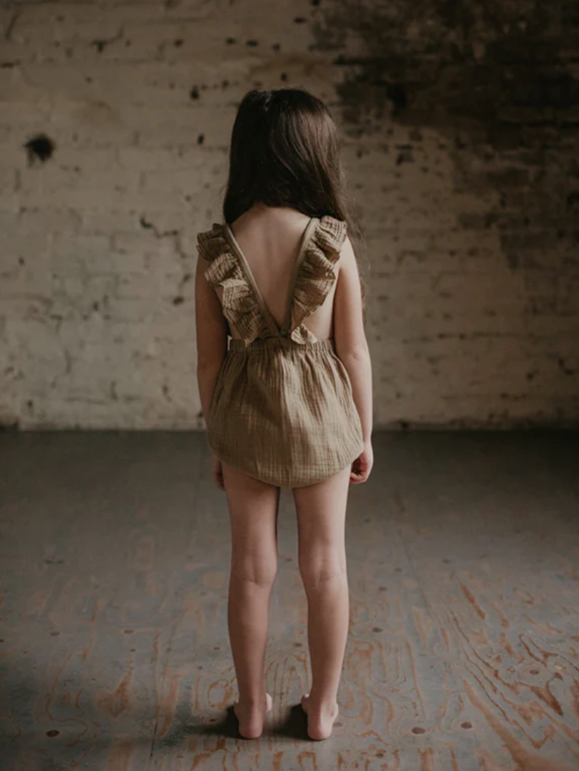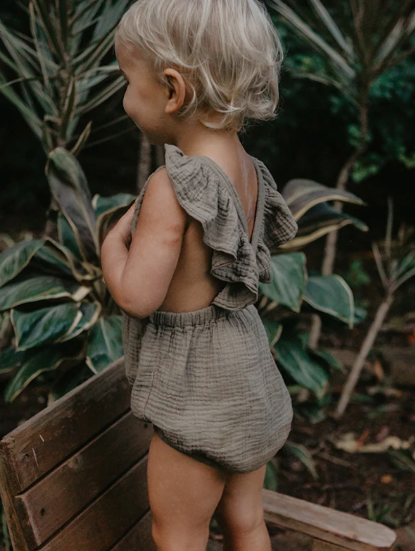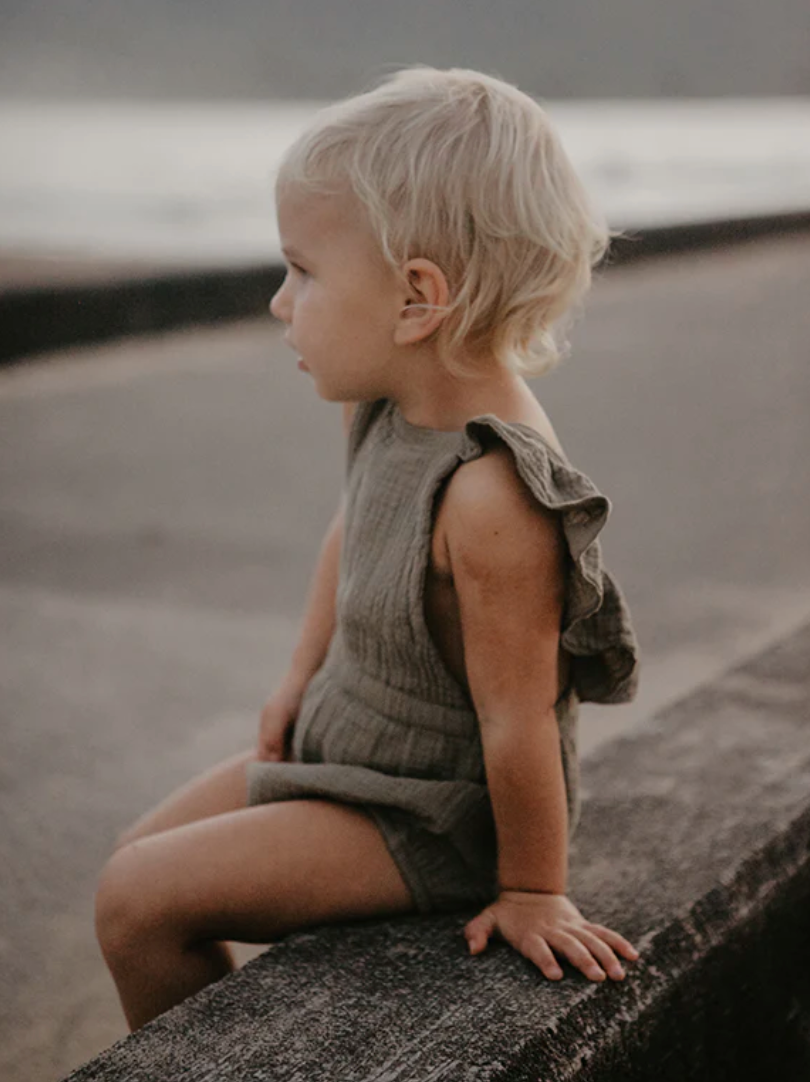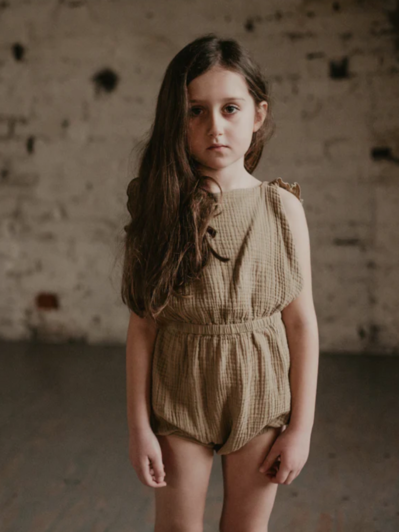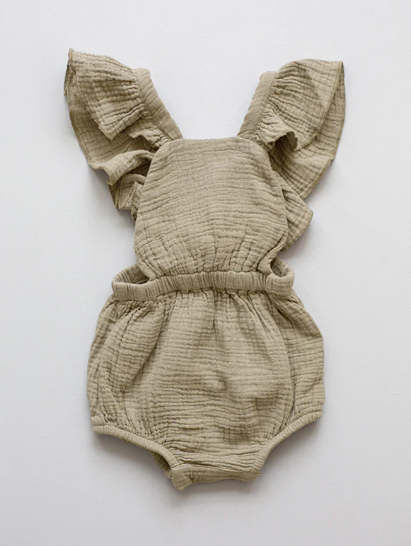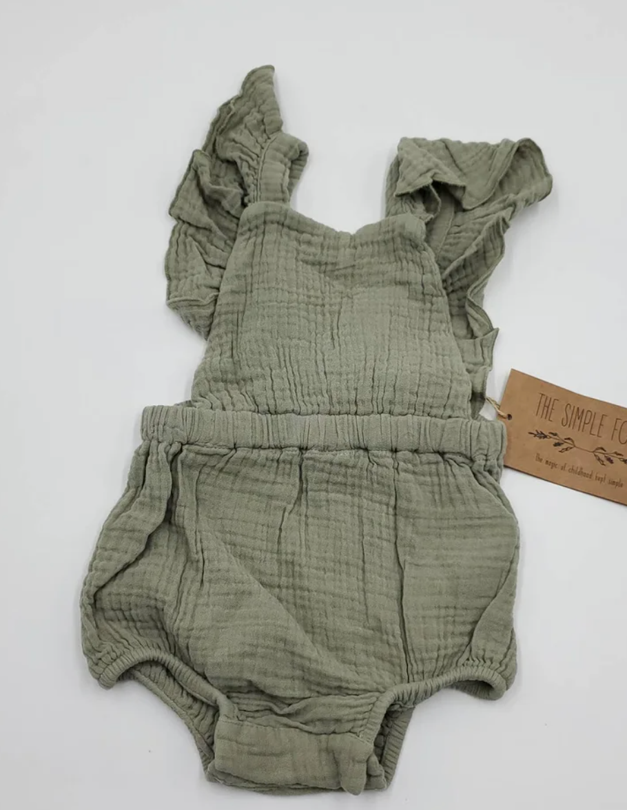 Lovingly made for picture perfect days, our darling romper features elastic at the waist and legs for a fit that stays in place. Made from the softest crinkled cotton muslin, it even includes hidden crotch snaps, up to 3 years, for diaper changes and hidden buttons and buttonholes so adjusting the straps for size is as easy and stylish as ever.
