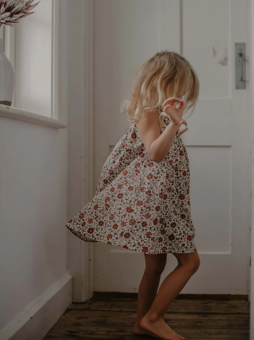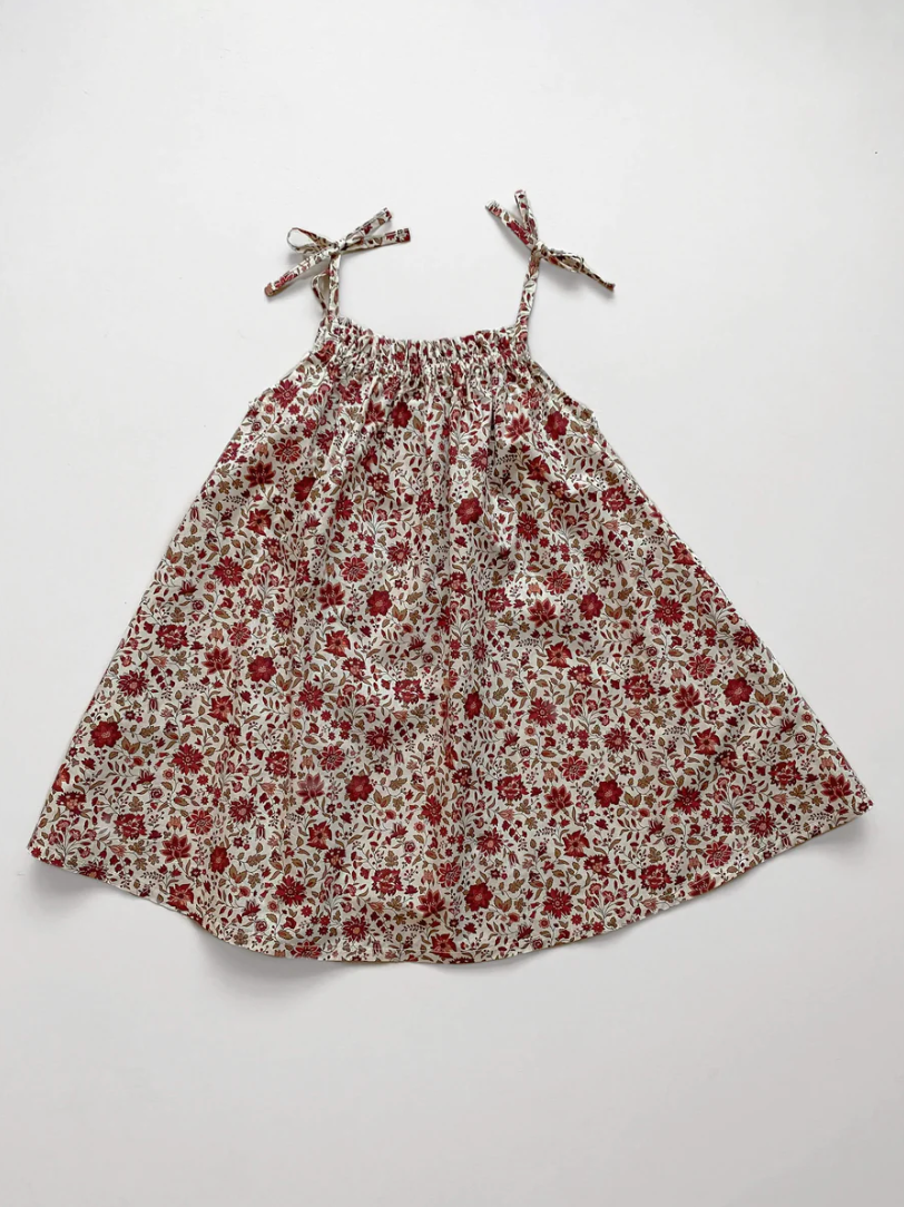 Inspired by hazy days sitting under a shady tree, this simple sun dress showcases our very special wildflower print. With a nod to spring shoots and designed with summer memories yet made in mind, it features delicate straps that tie into fixed bows at the shoulders and a loose and comfortable fit. The Liberty floral print makes it all the more enchanting for your very own little wildflowers with notes of deep red, antique rose, and sage on a beautiful cream base.
