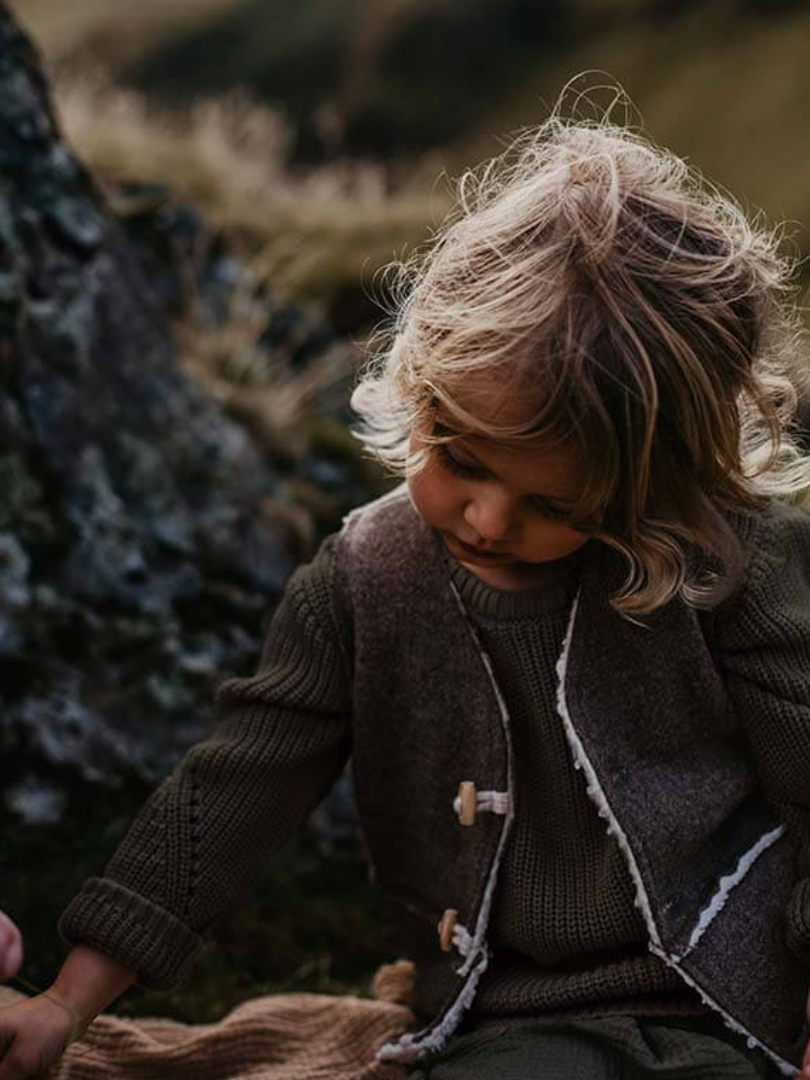 With simple, alpine charm, The Wool Vest is the winter staple of our dreams. It’s delightfully cozy with a relaxed fit, wooden toggles for ease, and lined with ethically sourced organic sherpa to keep them warm and snug.