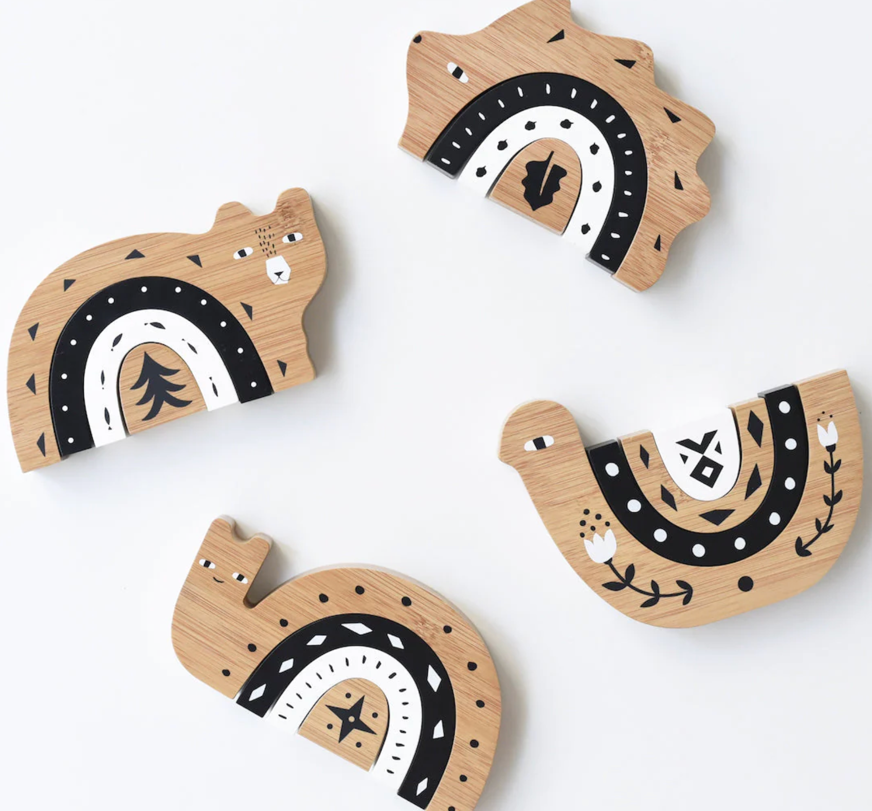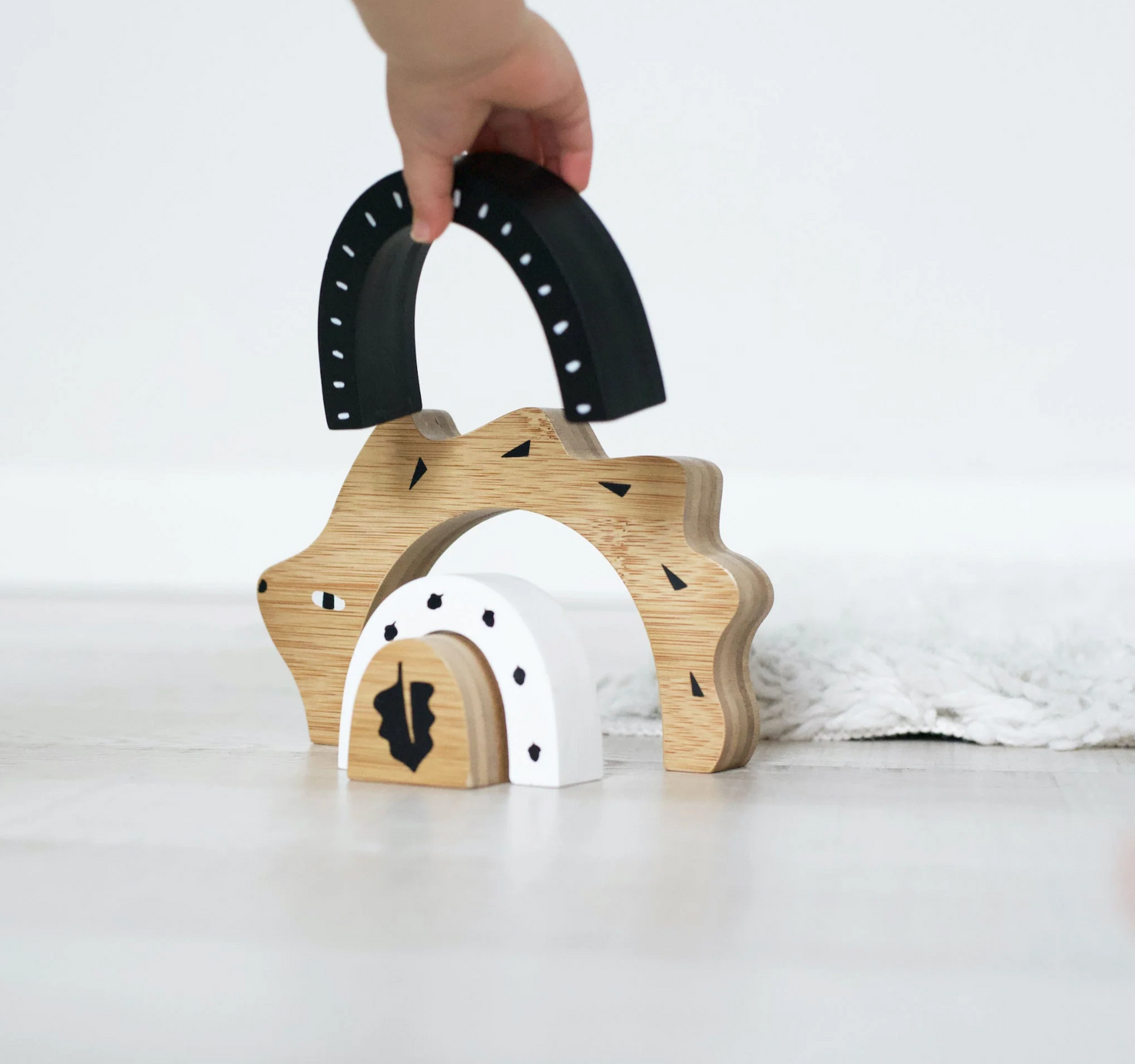 An arch or rainbow style stacker puzzle in adorable animal form, uniquely designed in Wee Gallery style — sure to delight toddlers and young children who enjoy balancing, problem solving, and imaginary play activities. A perfect addition to your scandinavian, woodland, or nature themed nursery decor.