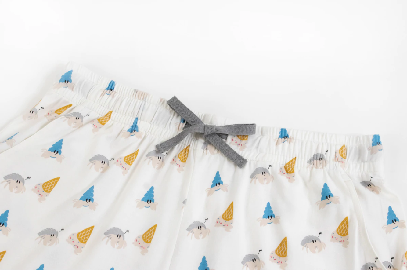 The short sleeve PJ set is in our colourful and fun Hermit Pals print, from our SS22 collection, By the Sea. It tells the tale of a hermit crab finding an ice cream friend at the beach.